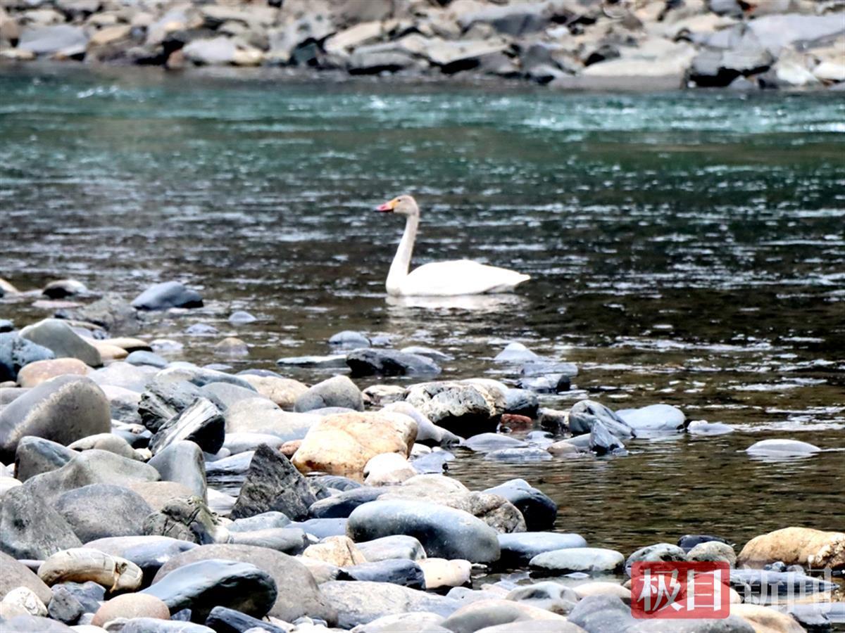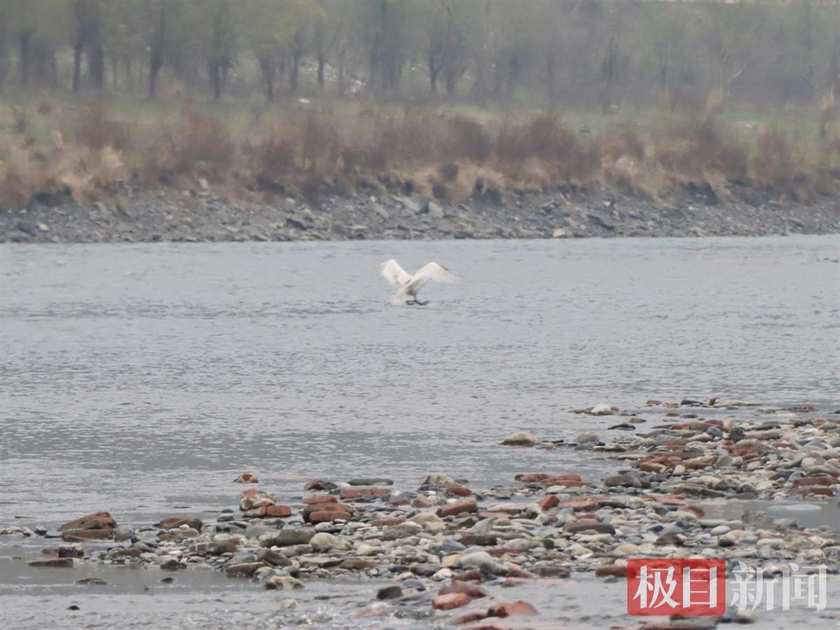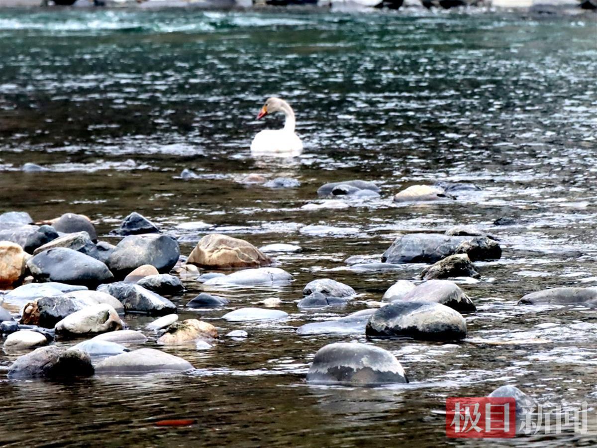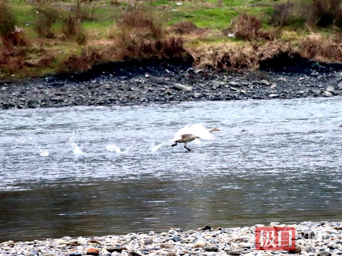 12月9日,一只天鹅在湖北竹山堵河里,时而漂流,时而漫步,时而贴着水面低飞、溅起朵朵水花,时而凌空飞向远方,时而在白鹭身边漫步。