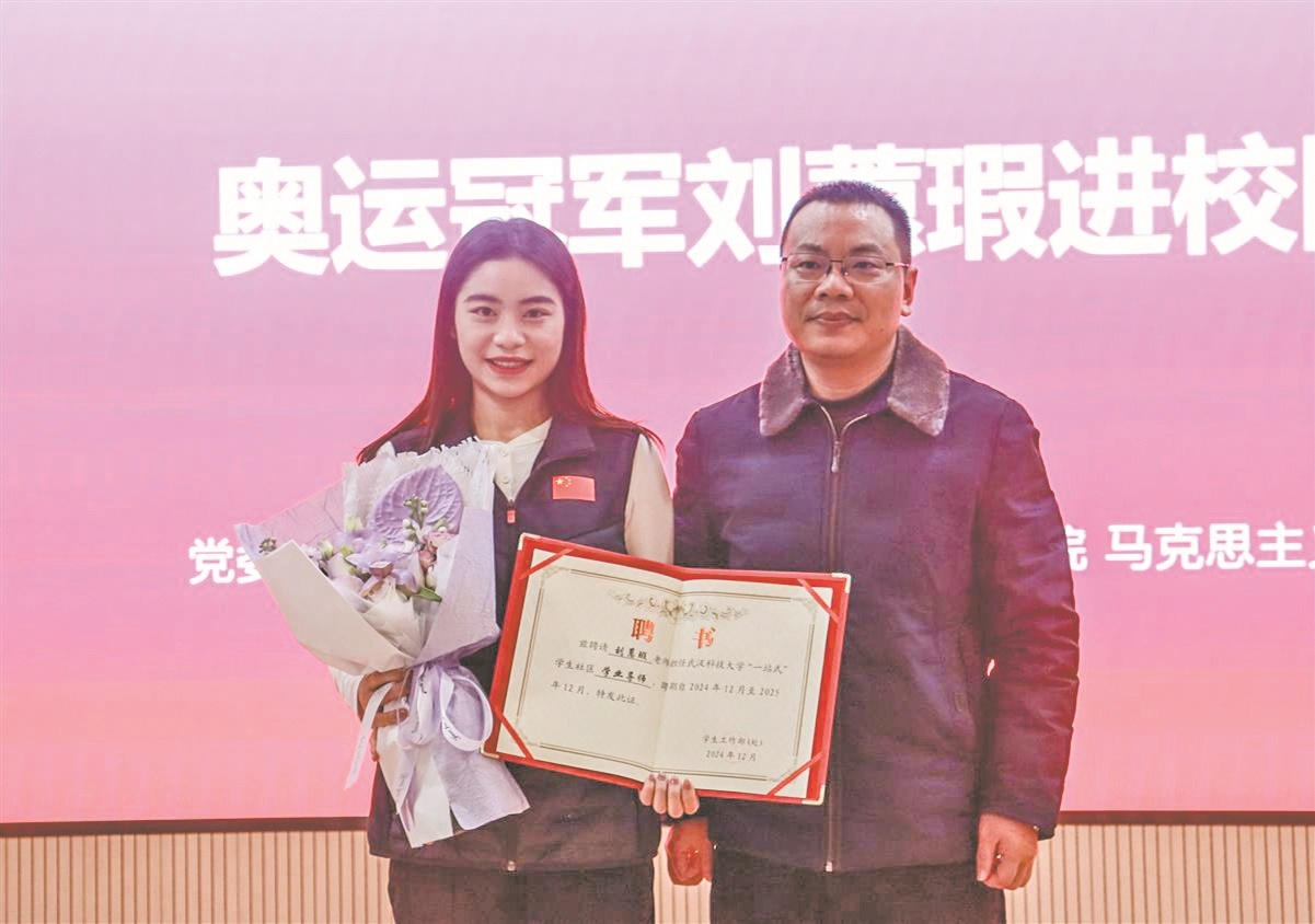 体育学院党委书记王永辉为刘蕙瑕颁发一站式学生社区学业导师聘书。该校党委学生工作部副部长杨永彬指出,奥运冠军刘蕙瑕的故事生动诠释了“更高更快更强更团结”的奥运精神,希望大学生们可以将这种奥运精神、体育精神融入日常的学习、工作、生活中去,不言弃不言败。