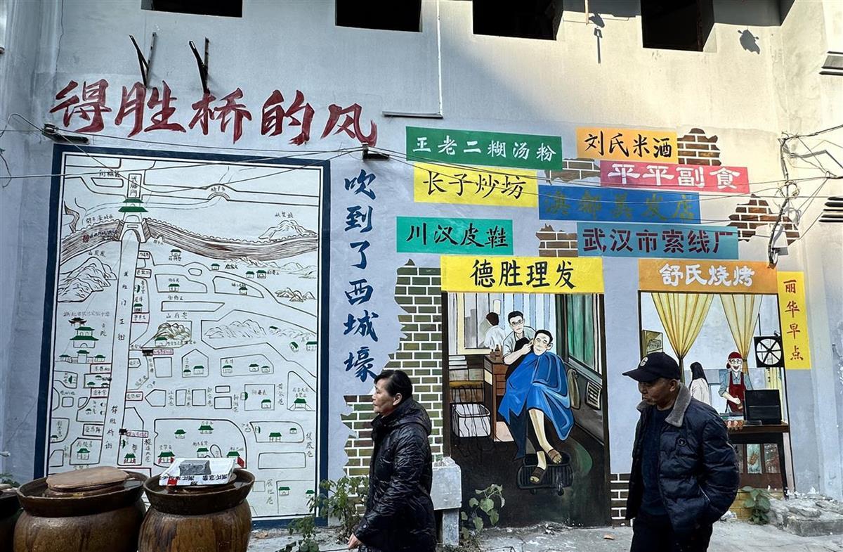 在得胜桥老街出口处,街口的墙上彩画着历史地图和武汉特色民俗,不少外地游客在这打卡留念。从此处向远望去,黄鹤楼悬于当空,蔚为壮观,与得胜桥烟火老街构成了独特的历史文化图景。