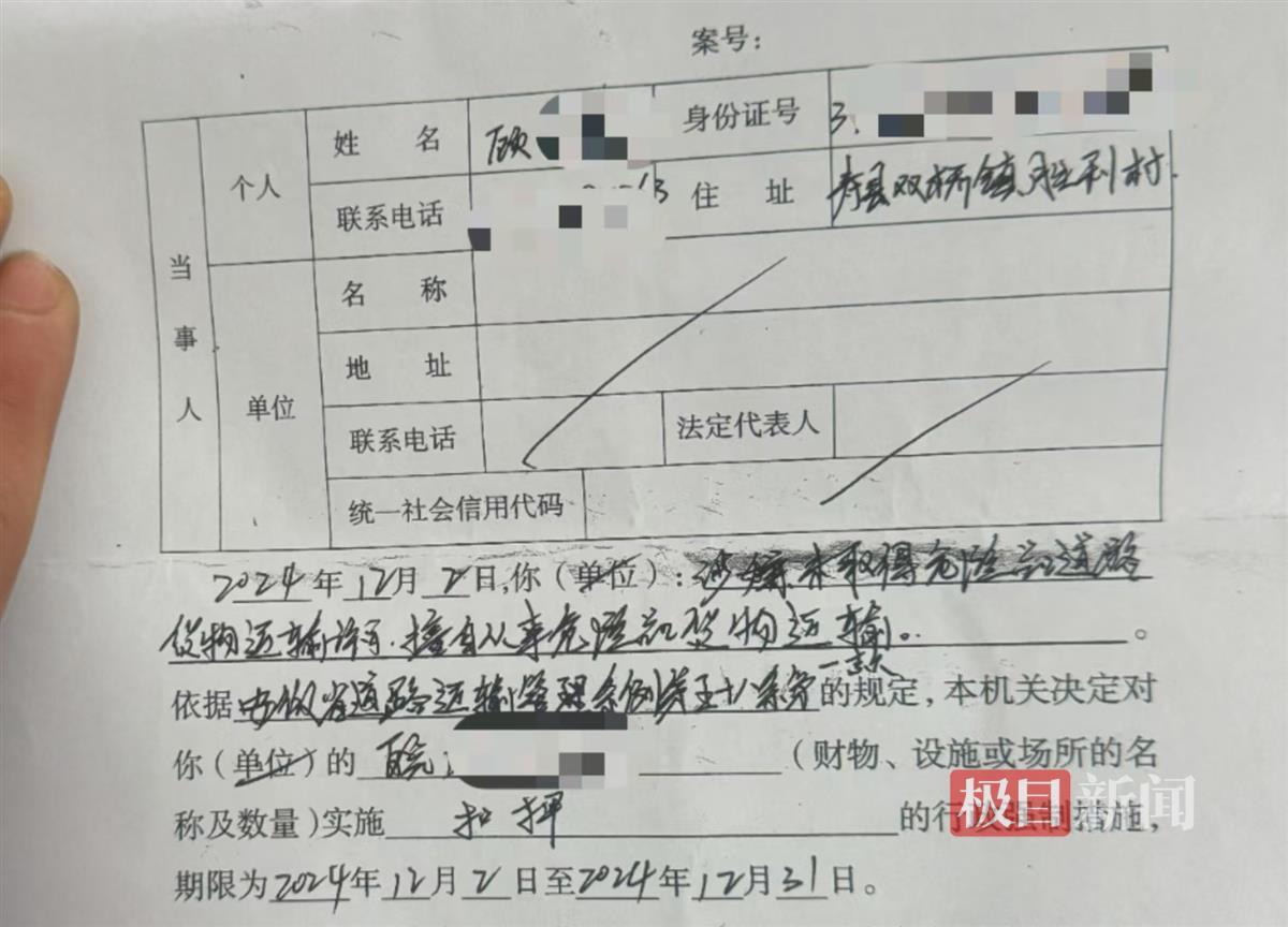顾小虎提供的淮安市交通运输局所开具《行政强制措施决定书》显示,因其涉嫌“未取得危险品道路货物运输许可擅自从事道路危险品运输”,依据《安徽省道路运输管理条例》第58条第一款规定,执法部门决定对运输车辆实施扣押的行政强制措施,期限为11月2日至12月2日,后又延长至12月31日。