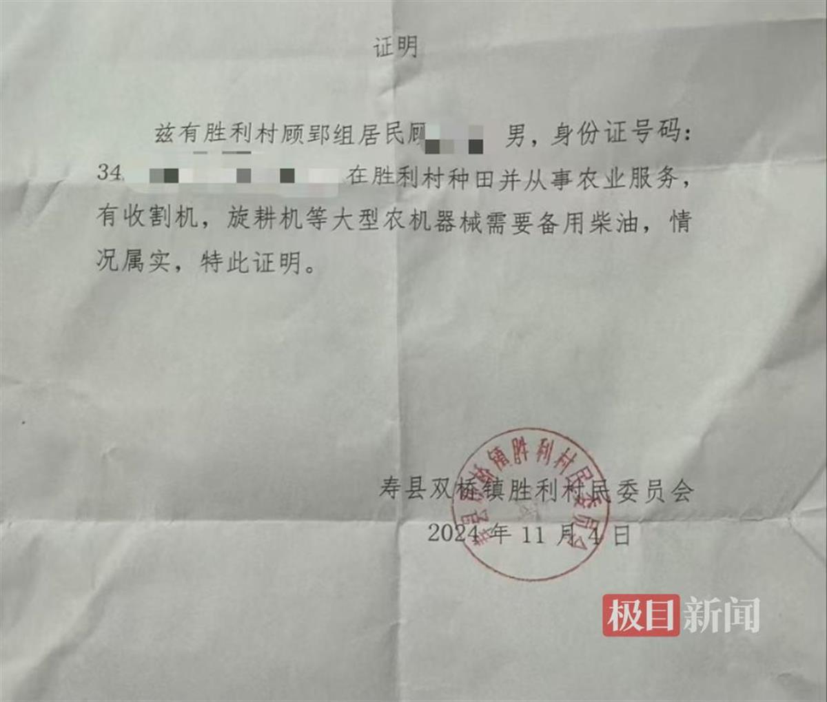 “他当时和我说没钱,我说你没钱的话,我可以借给你点。”胜利村村支书赵成刚告诉极目新闻记者,村委会还为顾小虎出具了情况证明,称他装运柴油为“收割机、旋耕机等大型农机器械需要”,而非经营售卖。