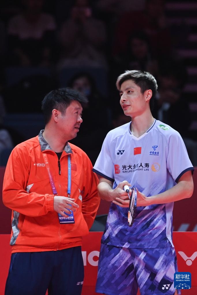 12月13日,石宇奇(右)在比赛暂停时与教练孙俊交谈。新华社记者 黄宗治 摄