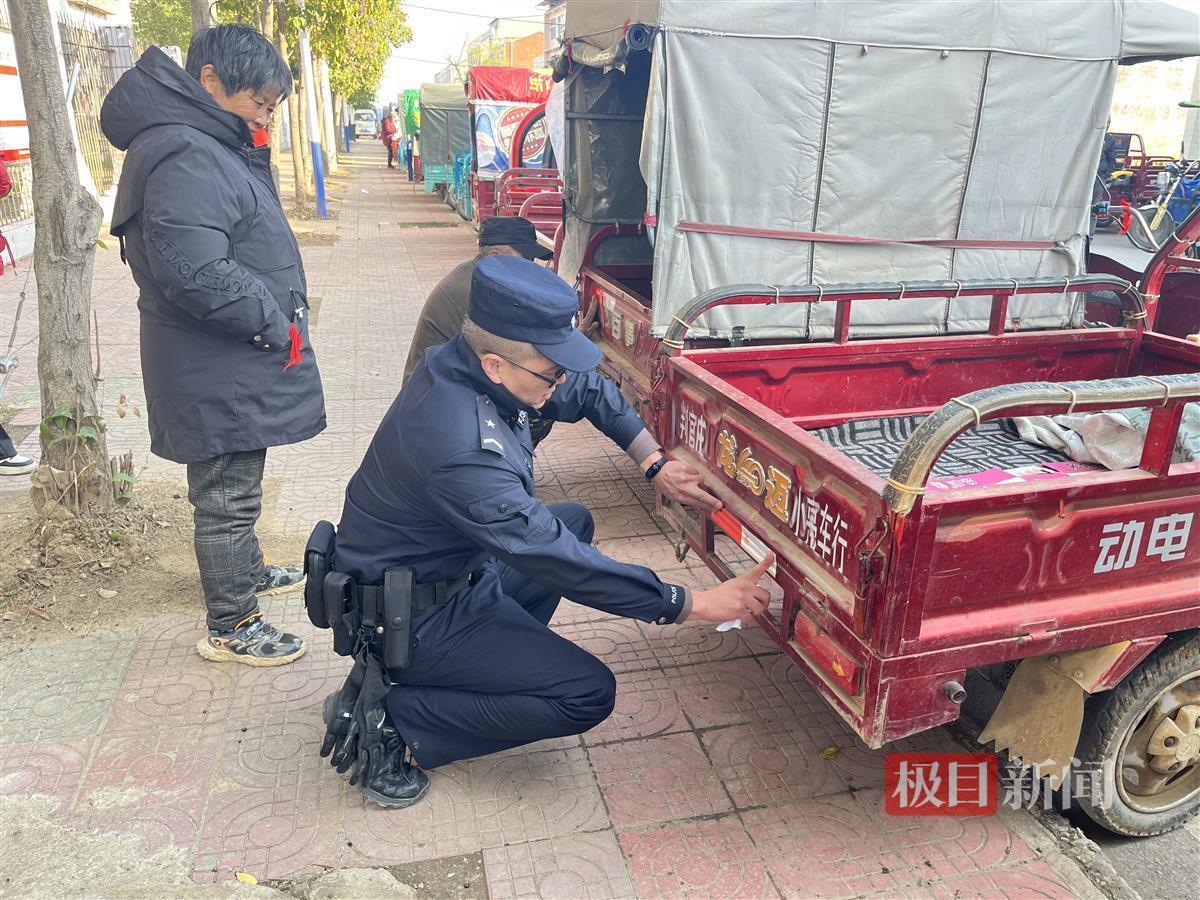 民警为电动三轮车粘贴反光标识(通讯员供图)