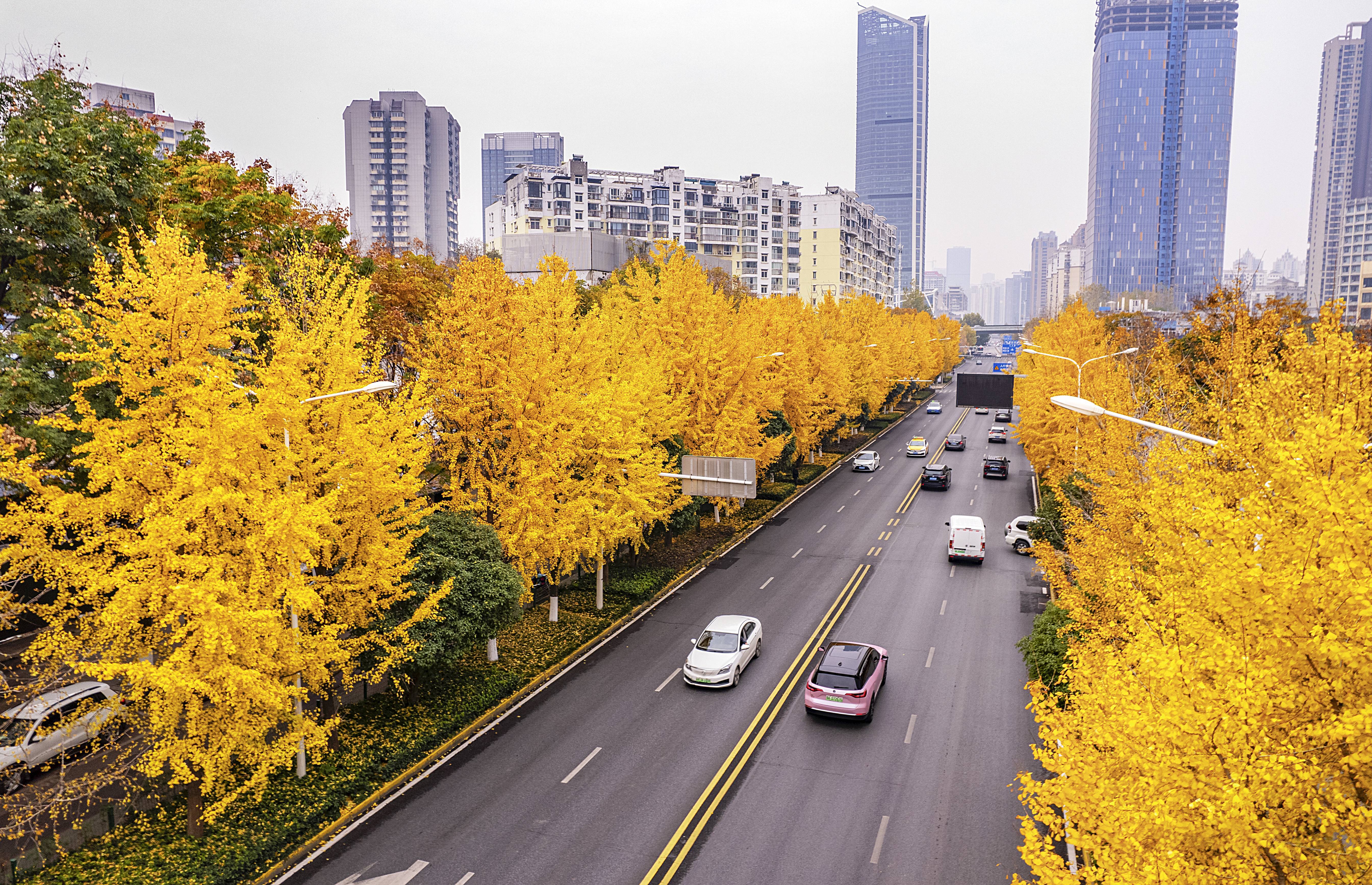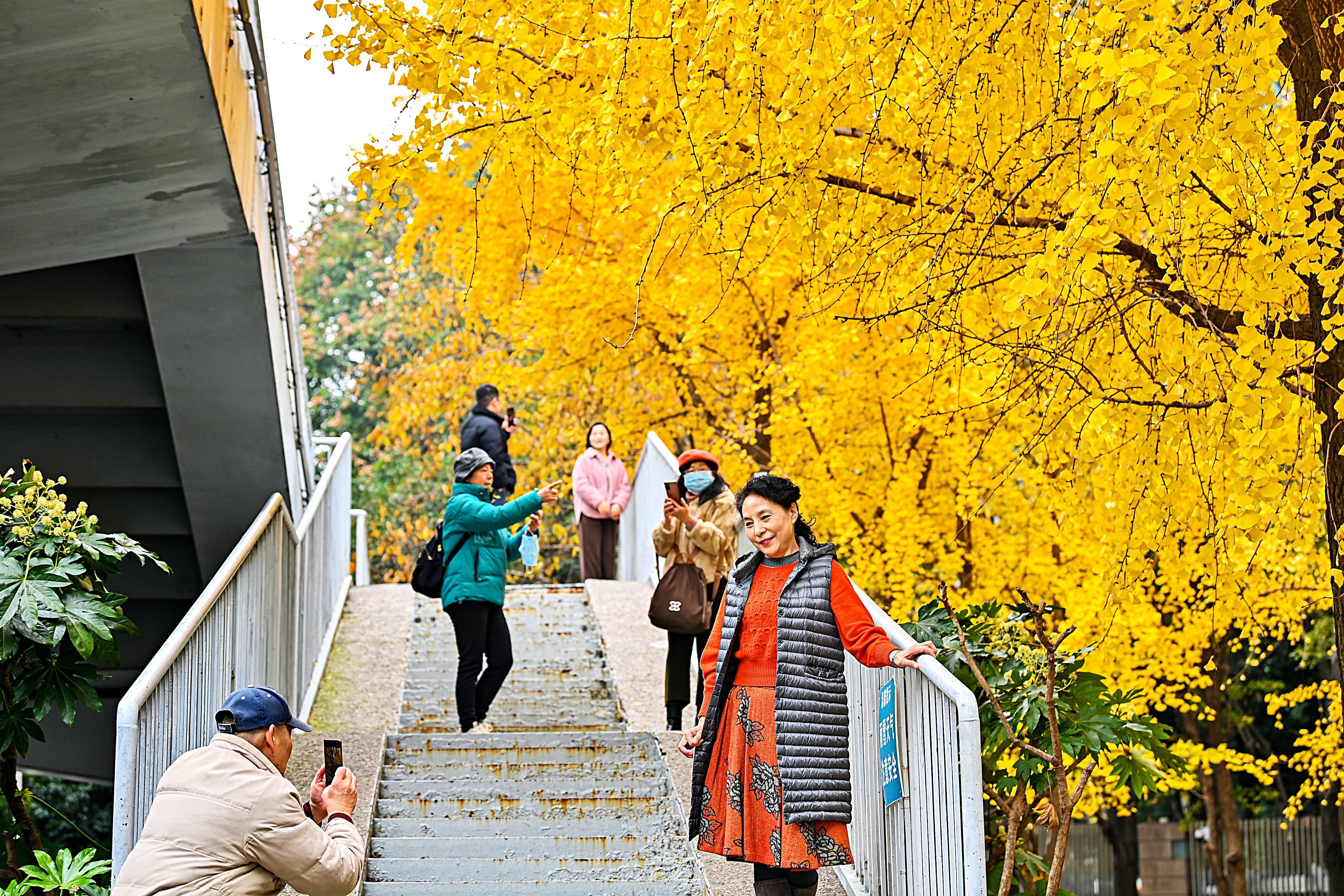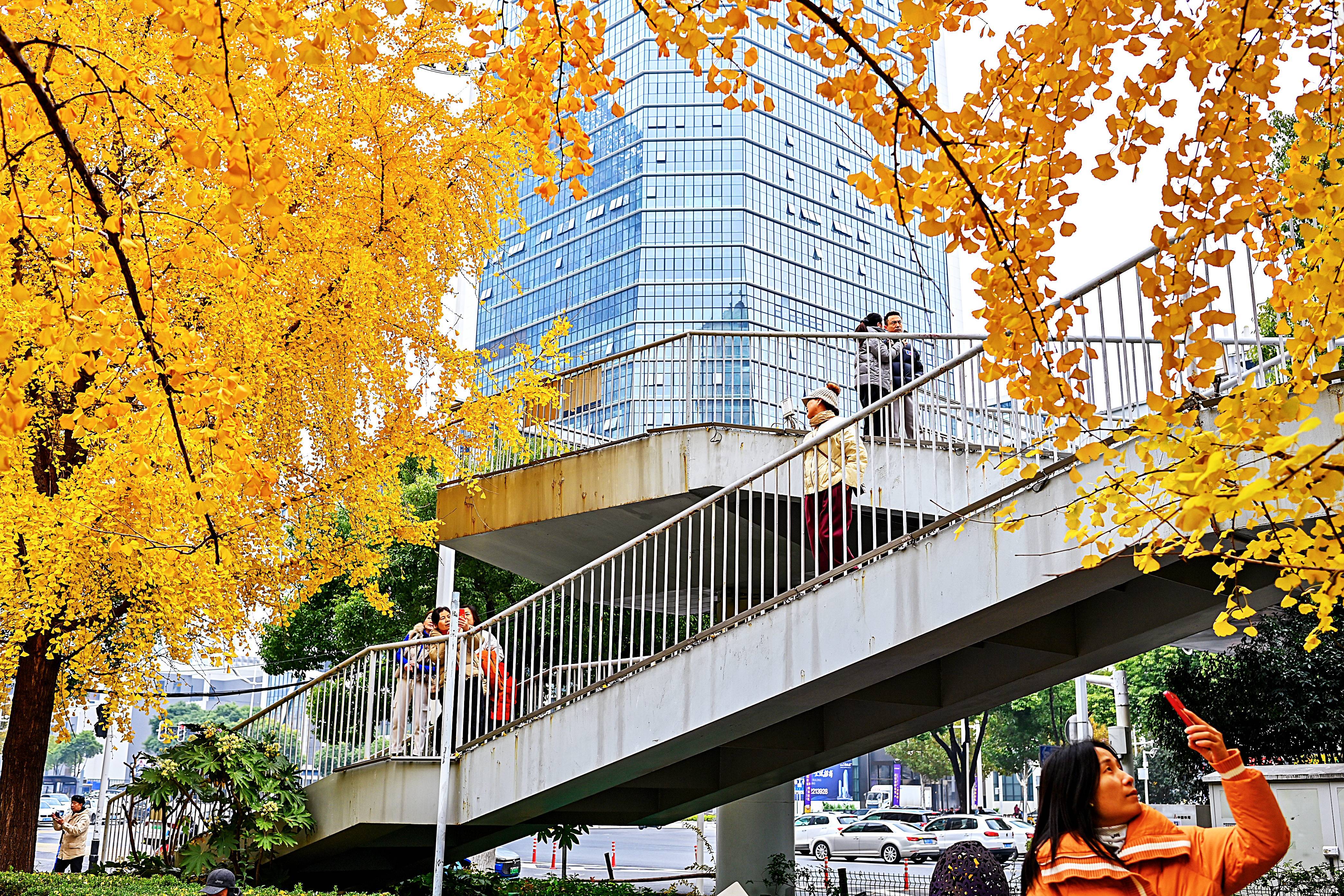 近日,武汉街头巷尾的银杏树叶已由绿变金黄,市民赏银杏无需远行,在家门口便可观赏到最美“银杏黄”。