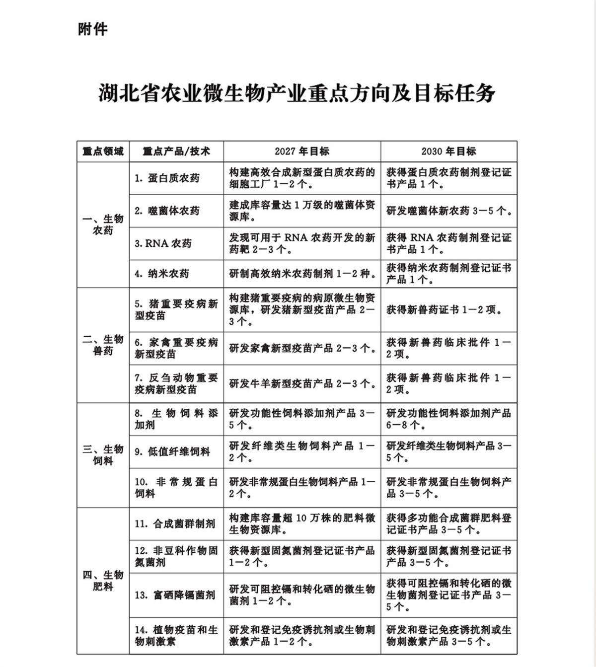 实施方案提出,聚焦生物农药、生物兽药、生物饲料、生物肥料、生物修复剂和生物技术等重点领域,重点研发具有自主知识产权和市场竞争力的新产品,攻关具有引领性和颠覆性的新技术。到2027年,取得标志性成果10项以上;到2030年,取得重大标志性成果30项以上,建成国内具有重要影响力的农业微生物技术创新策源地。