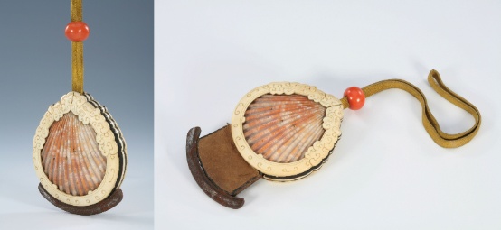 △ 象牙镶蛤蜊荷花式火镰及其抽出使用样式(右),沈阳故宫博物院藏