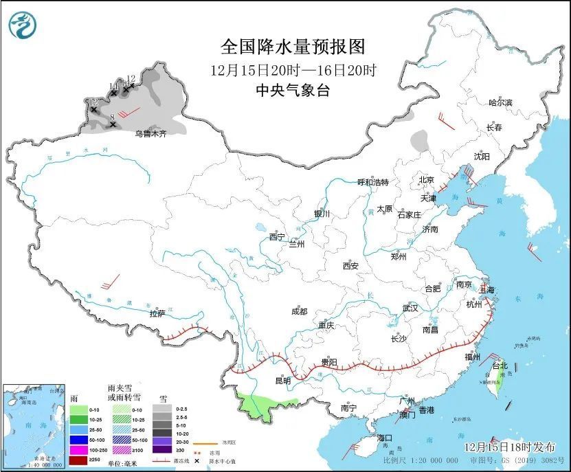 12月15日20时至16日20时,新疆北部、内蒙古中部等地部分地区有小雪,其中,塔城高海拔地区、伊犁河谷和沿天山地区等地部分地区有中到大雪,局地暴雪。云南南部、台湾岛东部等地部分地区有小雨。