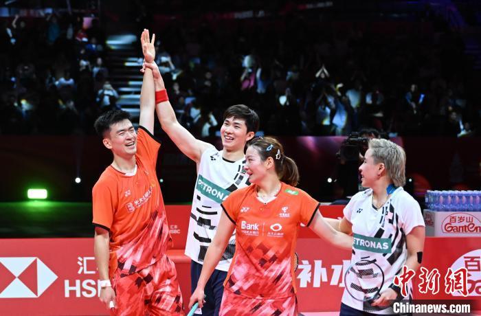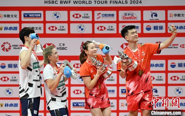 12月15日,2024世界羽联世界巡回赛总决赛在浙江杭州举行,中国组合郑思维(红衣,左)/黄雅琼(红衣,右)在混双决赛中2比1战胜马来西亚组合陈堂杰(白衣,左)/杜颐沩(白衣,右),夺得本项目冠军,“雅思组合”在国际赛场的比赛圆满谢幕。图为双方在赛后共同庆祝。中新社记者 王刚 摄