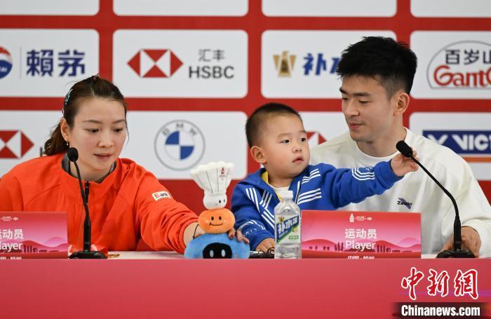 12月15日,2024世界羽联世界巡回赛总决赛在浙江杭州举行,中国组合郑思维(右一)/黄雅琼(左一)在混双决赛中2比1战胜马来西亚组合陈堂杰/杜颐沩,夺得本项目冠军,“雅思组合”在国际赛场的比赛圆满谢幕。图为郑思维带孩子参加新闻发布会。中新社记者 王刚 摄