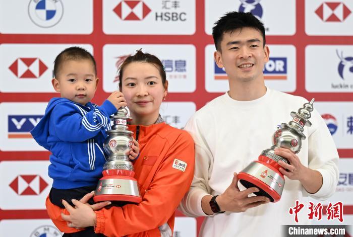 12月15日,2024世界羽联世界巡回赛总决赛在浙江杭州举行,中国组合郑思维(右一)/黄雅琼(中)在混双决赛中2比1战胜马来西亚组合陈堂杰/杜颐沩,夺得本项目冠军,“雅思组合”在国际赛场的比赛圆满谢幕。图为黄雅琼抱着郑思维的孩子一同参加新闻发布会并展示奖杯。中新社记者 王刚 摄