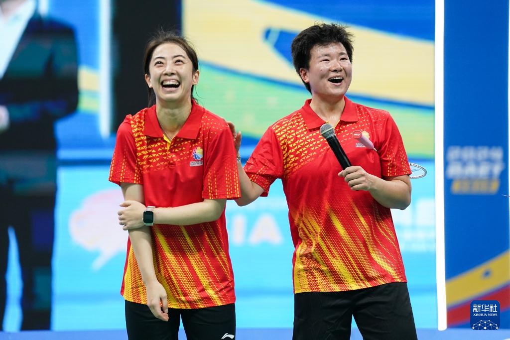 12月15日,王适娴(左)、何冰娇在明星挑战赛后接受采访。