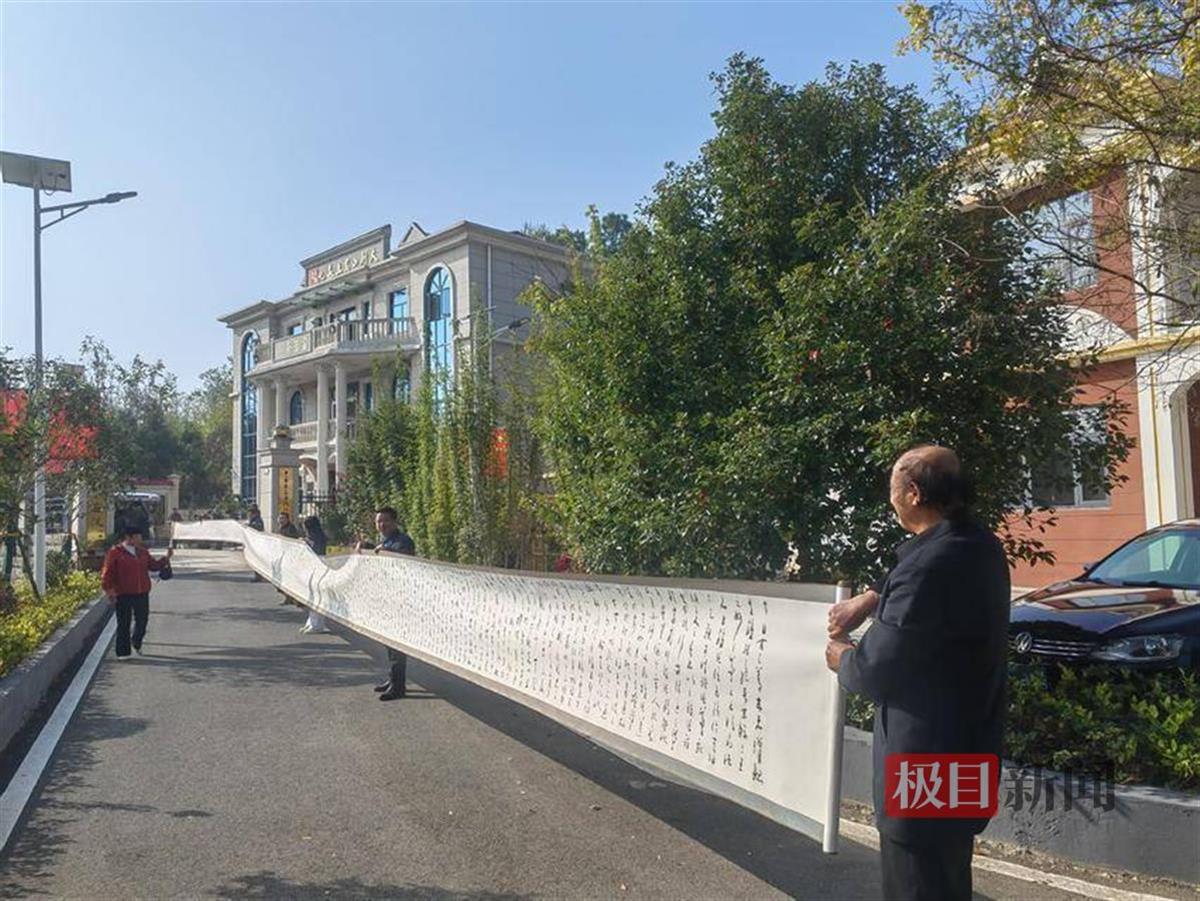 12月16日,极目新闻记者在现场看到,该长卷大字书法作品需要8人合力展开,作品笔势坚劲流畅、点画丰满圆转、轻重映带、变化无穷,成为一道壮观的艺术风景,让人惊叹不已。