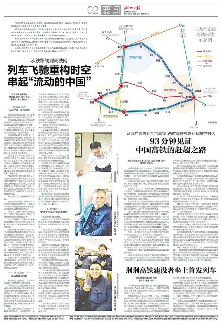 “报网端微屏”齐发力,全媒体精彩呈现,让新闻持续热辣滚烫。12月9日,《湖北日报》2版刊发《从铁路线到高铁网 列车飞驰重构时空串起“流动的中国”》《从武广高铁到荆荆高铁,两位高铁总设计师隔空对话 93分钟见证中国高铁的赶超之路》两篇深度报道;当晚,《新闻访谈丨开聊吧!在这趟特殊的高铁上》在湖北日报客户端刊发。