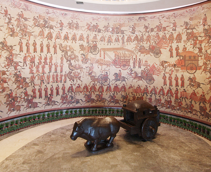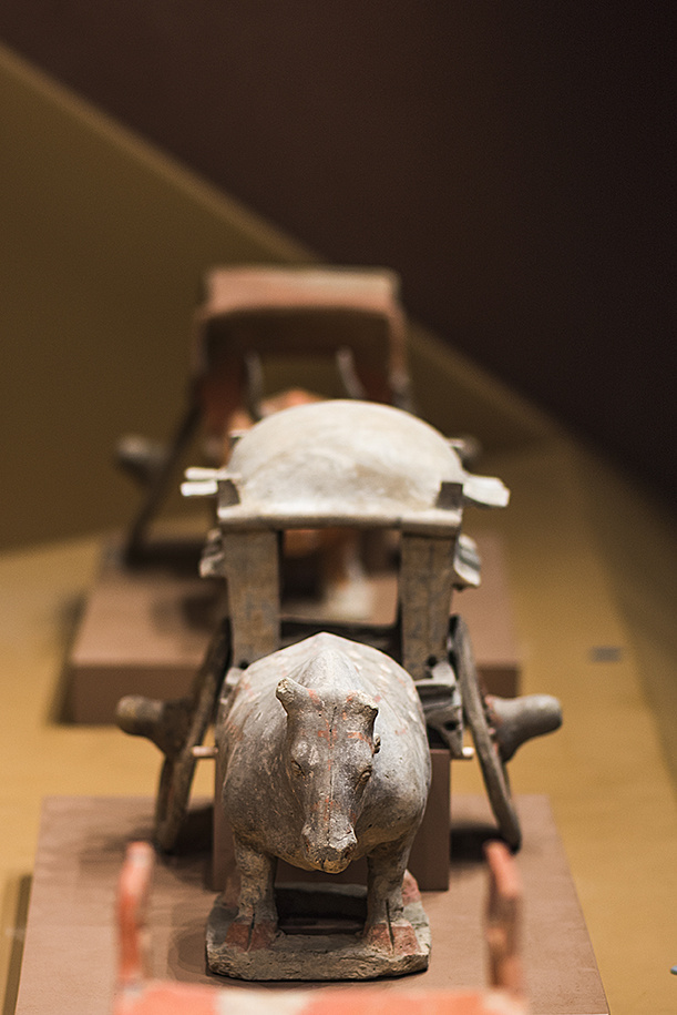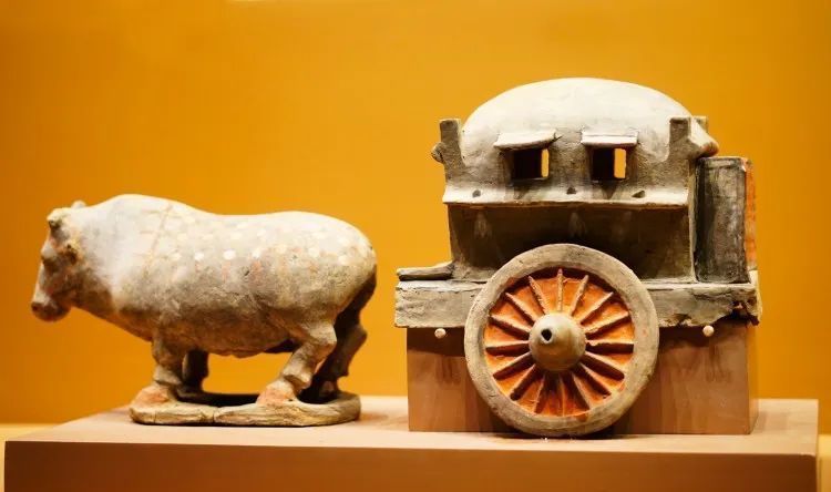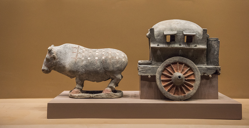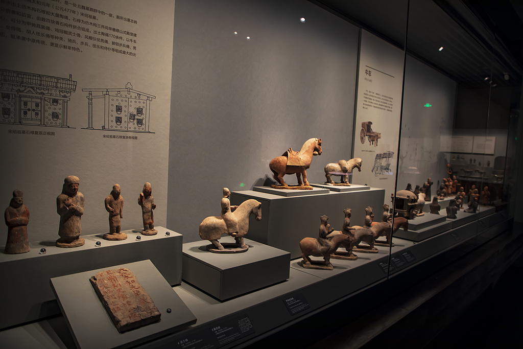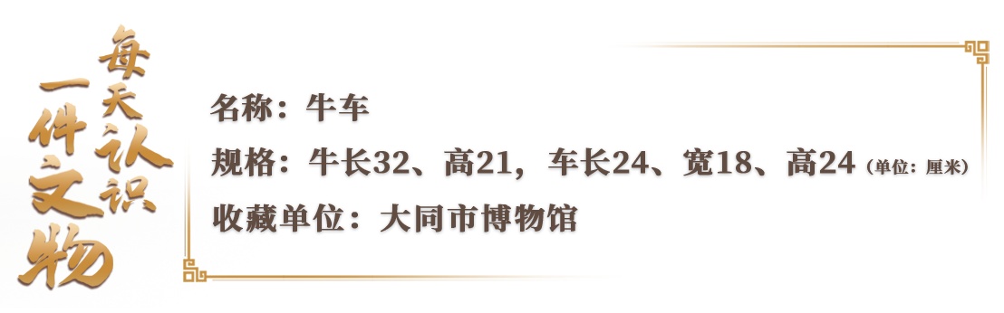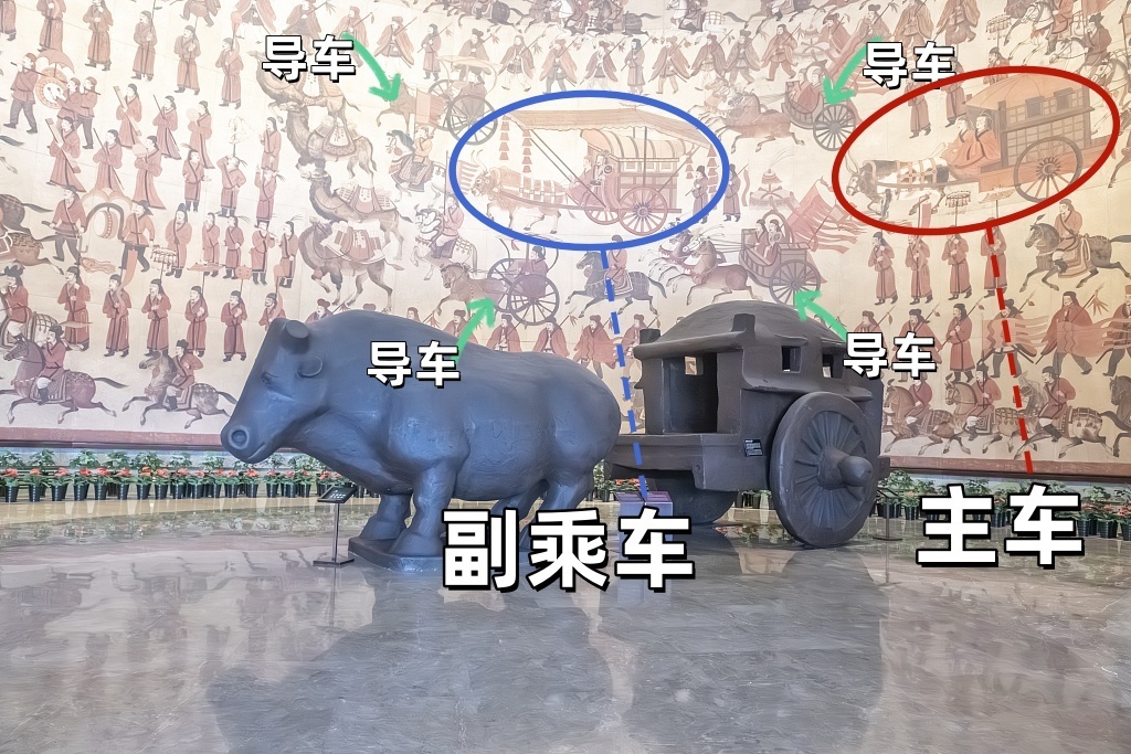 △大同市博物馆展厅内,一辆按比例浇铸的牛车和复原的北魏贵族出行图。