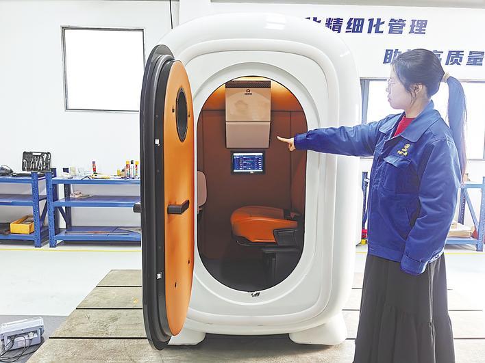 安全舱以黑白为主,造型如同一只Q版的企鹅。“安全舱高1.9米,占地1.08平方米,重200公斤,放在阳台或是屋里的某个角落就行。”中铁十一局电务公司安防事业部经理储奔指着安全舱说。舱内,以棕色为主,配备了柔软的沙发座椅和一个折叠椅,有显示屏和进风口、音响、空气和温湿度检测、舱内烟雾监测等多个装置。关上门后,点击屏幕上的按键,轻风徐徐吹来,开始制氧。舱内空间看似不大,但足够容纳下身高1.85米、体重200斤的储奔和他的两名男同事。“身上再坐个小孩也没问题,完全够一家四口使用。”储奔说。