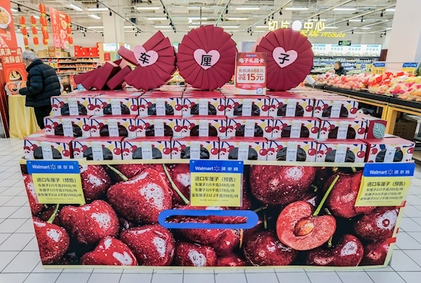 在武昌徐东的一家连锁超市里,车厘子的推介和促销广告摆放在了进门的醒目位置。其中,“预售”模式和价格让人心动不已——同样品种的2个J规格车厘子,目前的零售价为每斤60元,而预售价则为288元10斤,算下来一斤只要28.8元,还不到现售价的一半。