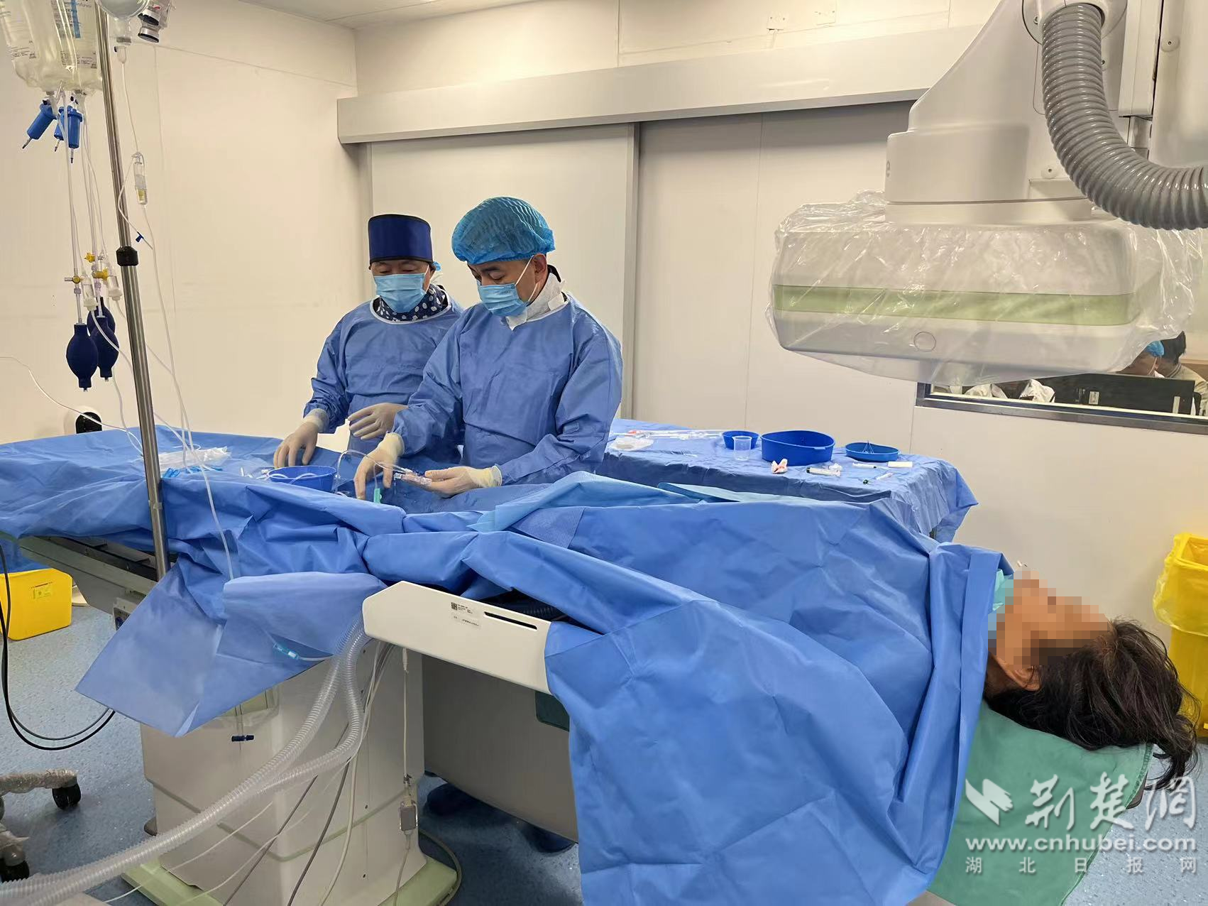 12月11日,66岁的徐女士在家中突发头痛、头昏、乏力,右侧肢体无力,并伴有多次恶心呕吐,晕倒在地后,被家人拨打120紧急送入孝感市中医医院。检查显示蛛网膜下腔出血,急诊以大脑中动脉瘤破裂伴蛛网膜下腔出血收入外一科住院。患者随时可能病情恶化,导致脑疝、迟发性脑出血、癫痫、急性心肌梗死、肺栓塞、应激性溃疡急性脑梗塞、恶性心律失常、多器官功能不全甚至心脏骤停等危险。ICU主任沈传运和神经外科主任颜学槐会诊后,徐女士被转入ICU进行重症监护支持治疗。与此同时,孝感市中医医院通过医联体,邀请武汉市第一医院罗明教授星夜驰援。