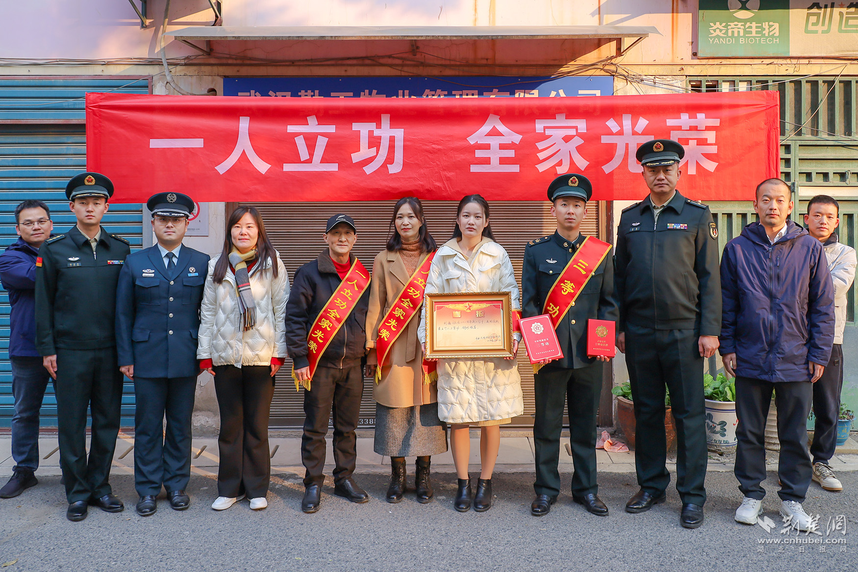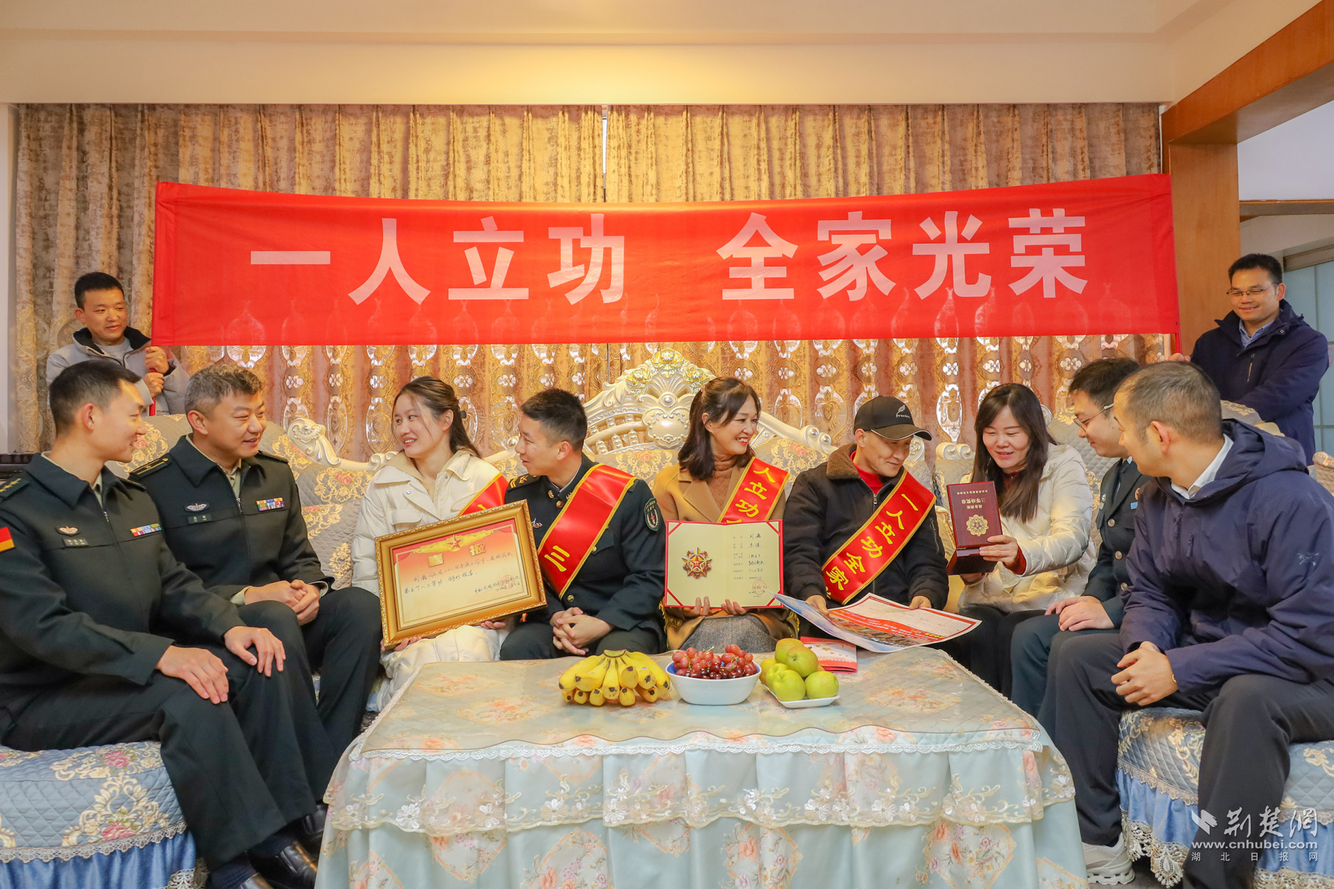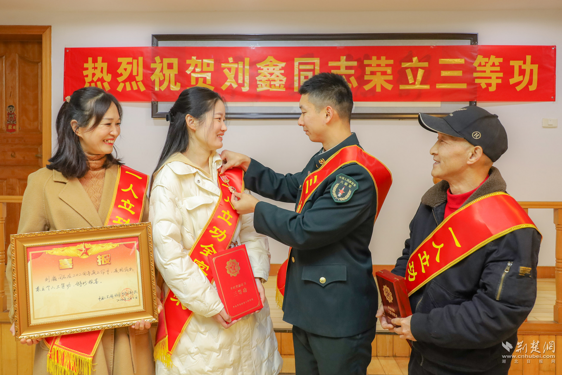 荆楚网(湖北日报网)讯(通讯员舒威)一张张喜报、一份份荣誉,连着军人的士气,系着军属的期盼。12月19日上午,武汉市江夏区人民武装部联合江夏区退役军人事务局、火箭军北京某部队、纸坊街道退役军人服务站来到纸坊街道现役军人刘鑫家中,开展为荣立三等功现役军人家庭送立功喜报活动,为现役军人家庭带去了党和政府的温暖与关怀。