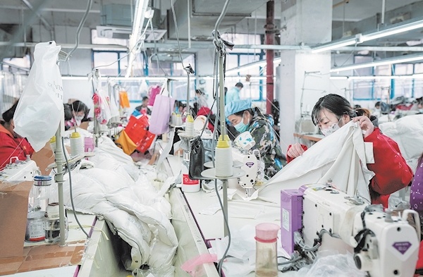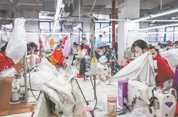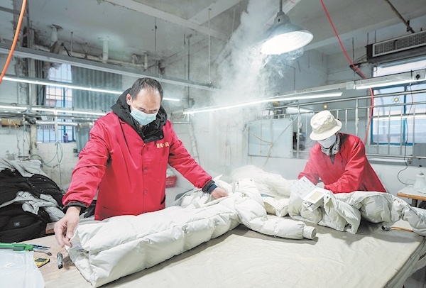 星悦亮服饰的2楼车间,数百盏日光灯亮着,师傅们正撸起袖子加油干:缝纫师傅头也不抬地踩着缝纫机,钉扣眼的师傅麻利地操作着设备,熨烫师傅不到一分钟就将一件羽绒服熨烫得平平整整……