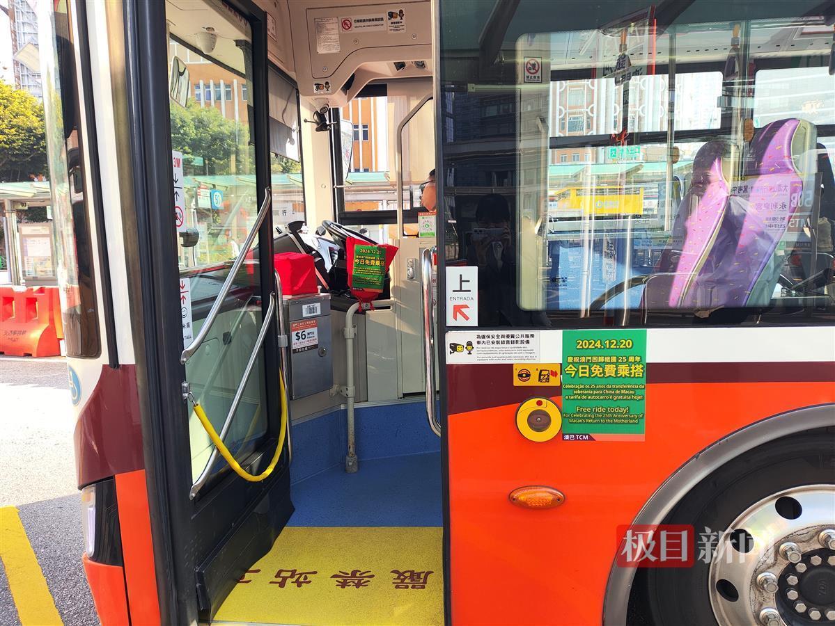 12月20日上午,记者乘坐澳门巴士时看到,巴士车身上张贴着“庆祝澳门回归祖国25周年,今日免费乘搭”的标识,车上的收银机已用红色的布袋罩住,乘客无需缴费即可乘车。