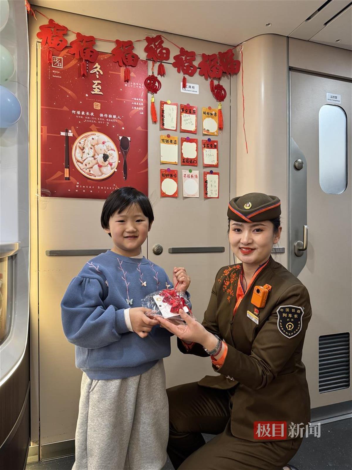 “冬至节大如年”。冬至节气即将到来,近日,武汉客运段在G70次等列车上精心筹备了“冬至暖心”活动。该乘务组乘务人员装点布置车厢,营造喜庆氛围,福字与心愿卡相互映衬,饺子和汤圆的香气弥漫在空气中,乘务人员为旅客送上了诚挚的冬至祝福。