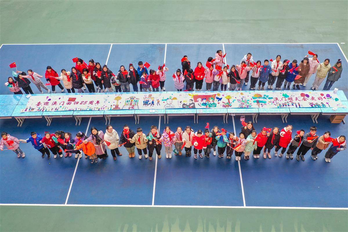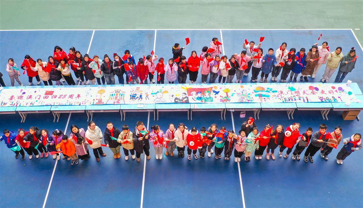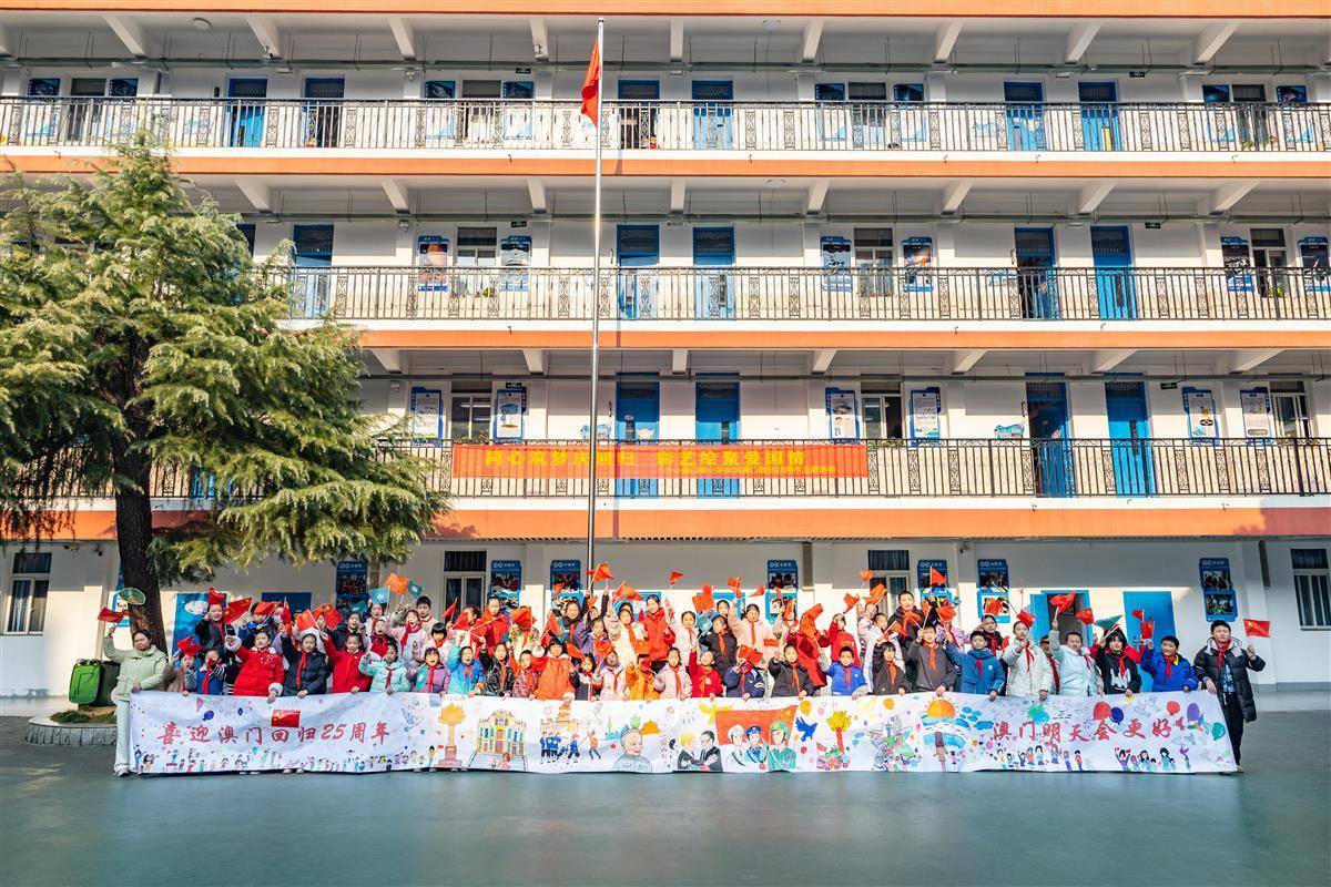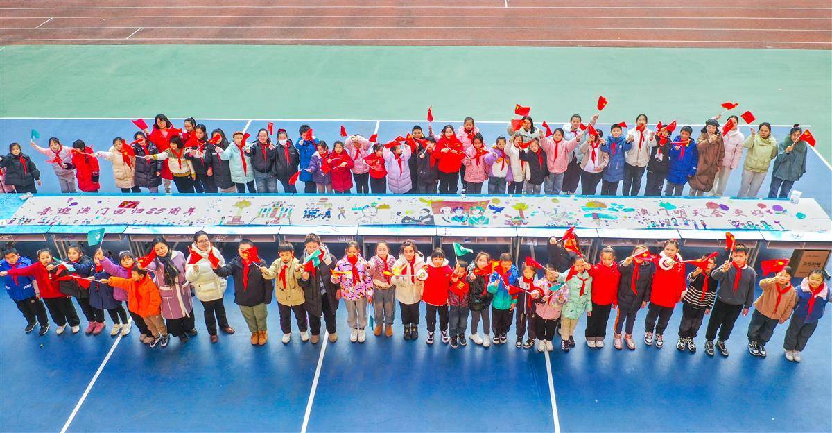 2024年12月20日,澳门路小学各年级同学与绘制完成的长卷合影,共同庆祝澳门回归25周年。