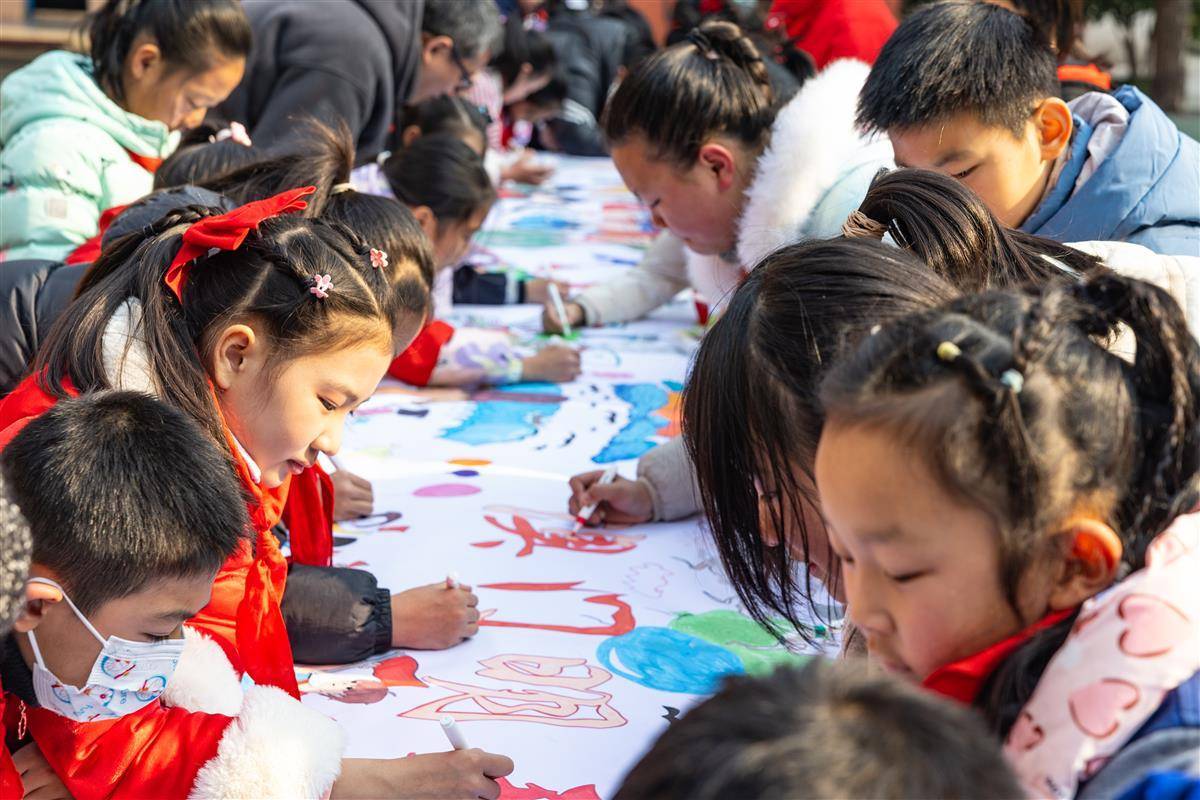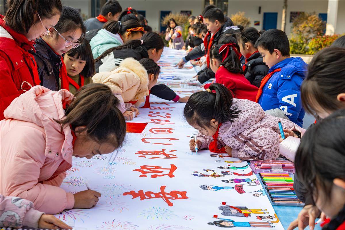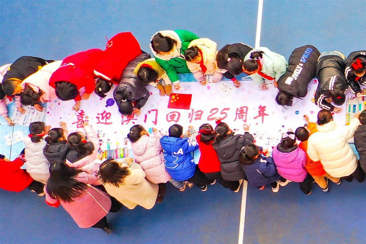 2024年12月20日,澳门路小学各年级同学与绘制完成的长卷合影,共同庆祝澳门回归25周年。
