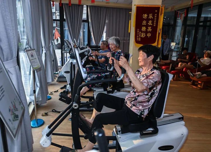 在浙江省嘉兴市南湖区新嘉街道电子社区邻里中心的长者运动健康之家内,老人们在进行器械锻炼。新华社记者 徐昱 摄