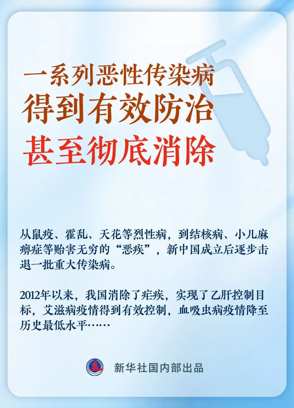 2012年以来,我国消除了疟疾,实现了乙肝控制目标,艾滋病疫情得到有效控制,血吸虫病疫情降至历史最低水平……一系列了不起的壮举,进一步筑牢织密公共卫生防护网。