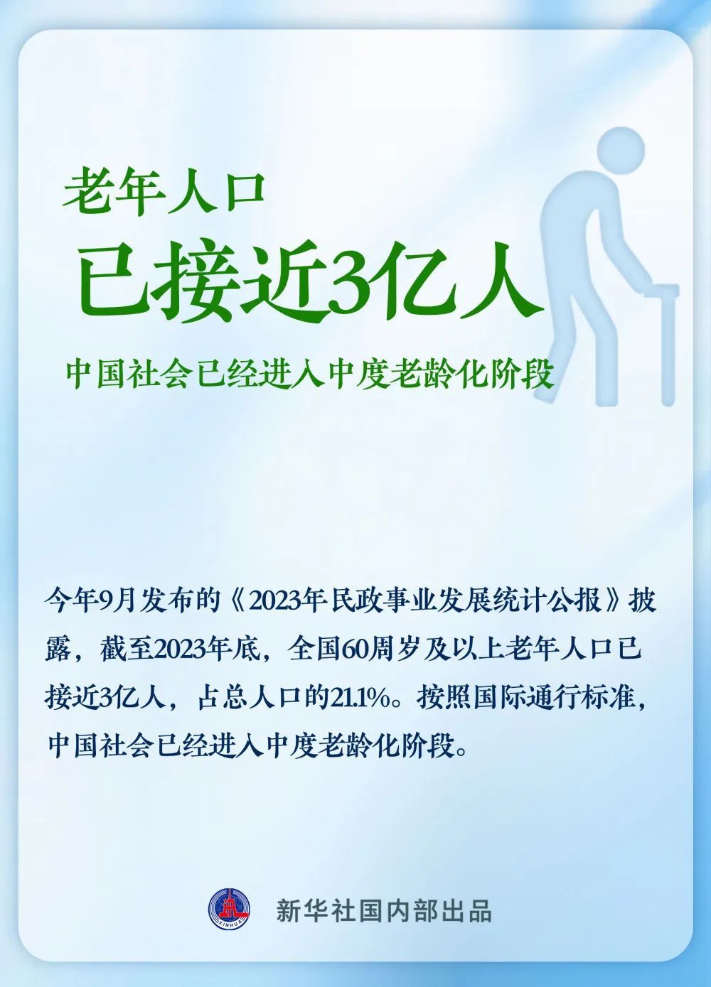 今年9月发布的《2023年民政事业发展统计公报》披露,截至2023年底,全国60周岁及以上老年人口已接近3亿人,占总人口的21.1%。按照国际通行标准,中国社会已经进入中度老龄化阶段。