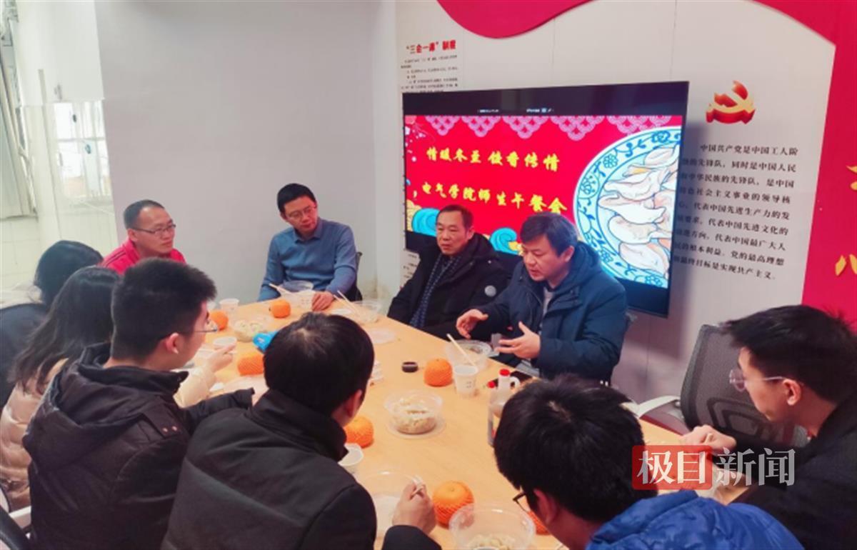 研究生考试前夕,在学校金银湖校区禾园四舍的“一站式”学生服务社区,电气与电子工程学院的老师和考研学生代表一起吃饺子,共度冬至佳节,在热气腾腾的饺子中为考研学子加油鼓劲。“饺子暖了胃,更暖了我们的心,我们将带着老师们的殷切期望全力以赴”电气学院考研学子冯翔宇说。