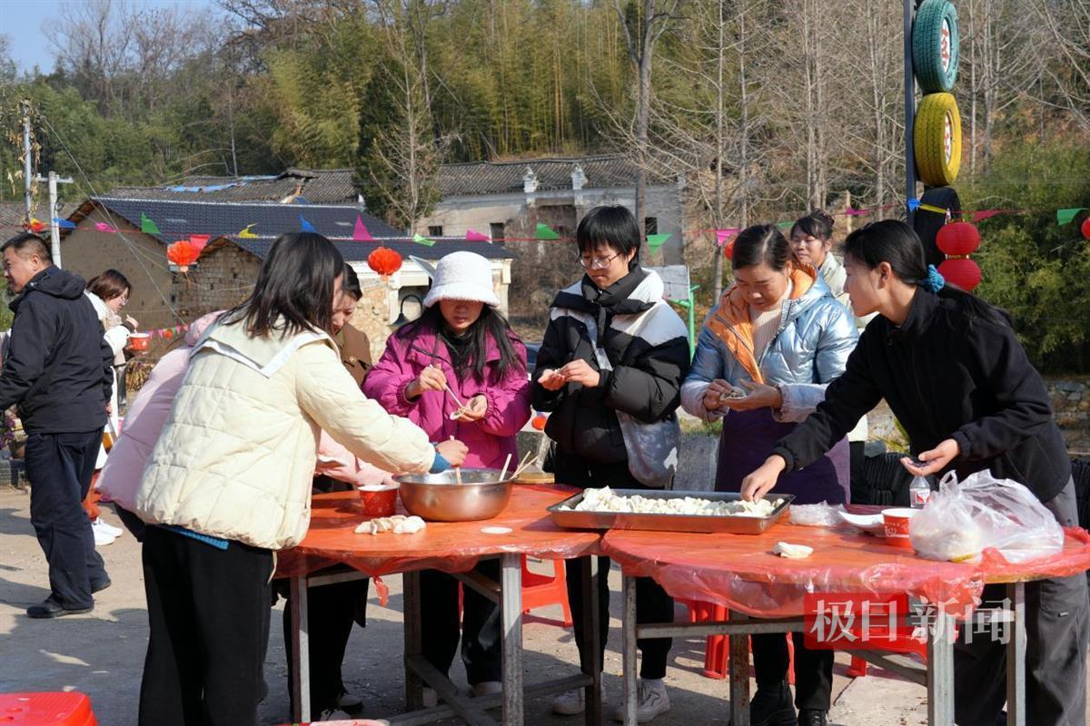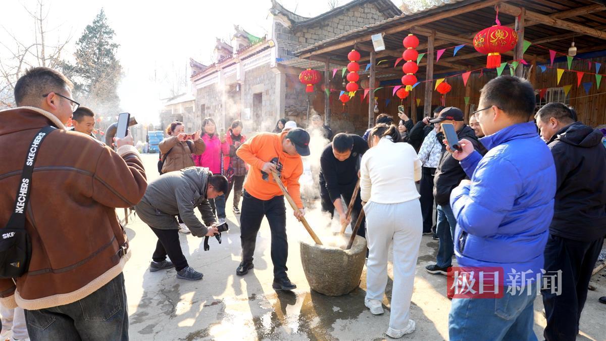 村民与游客齐聚,包出形态各异的饺子,一旁的手工豆丝制作,也围满了人,大家目不转睛地观看。还有人三五成群地打着糍粑,引得游客兴致勃勃地加入。在这个传统古村,大家共品冬至民俗,乐享假日。