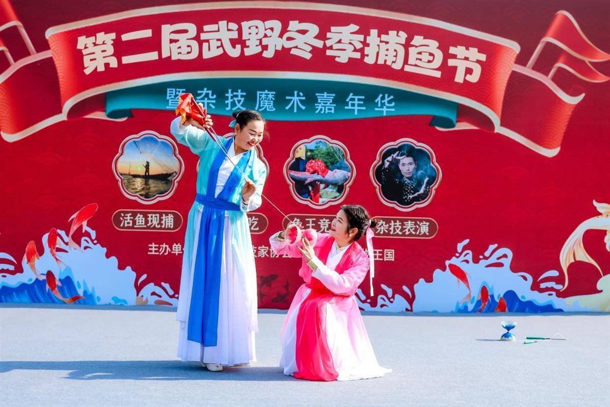 本次冬季捕鱼节,不仅可以亲眼见证捕鱼的整个过程,更有湖北省杂技家协会呈现的杂技魔术嘉年华,《花式叠罗汉》《鸽剧魅影·年年有鱼》为丰收喝彩,妙趣横生的《欢乐厨房》等节目赢得现场群众阵阵欢呼。
