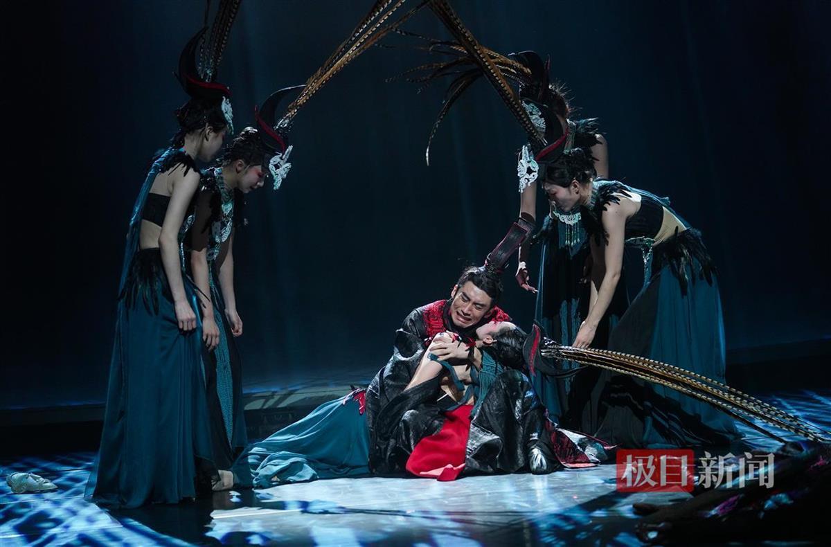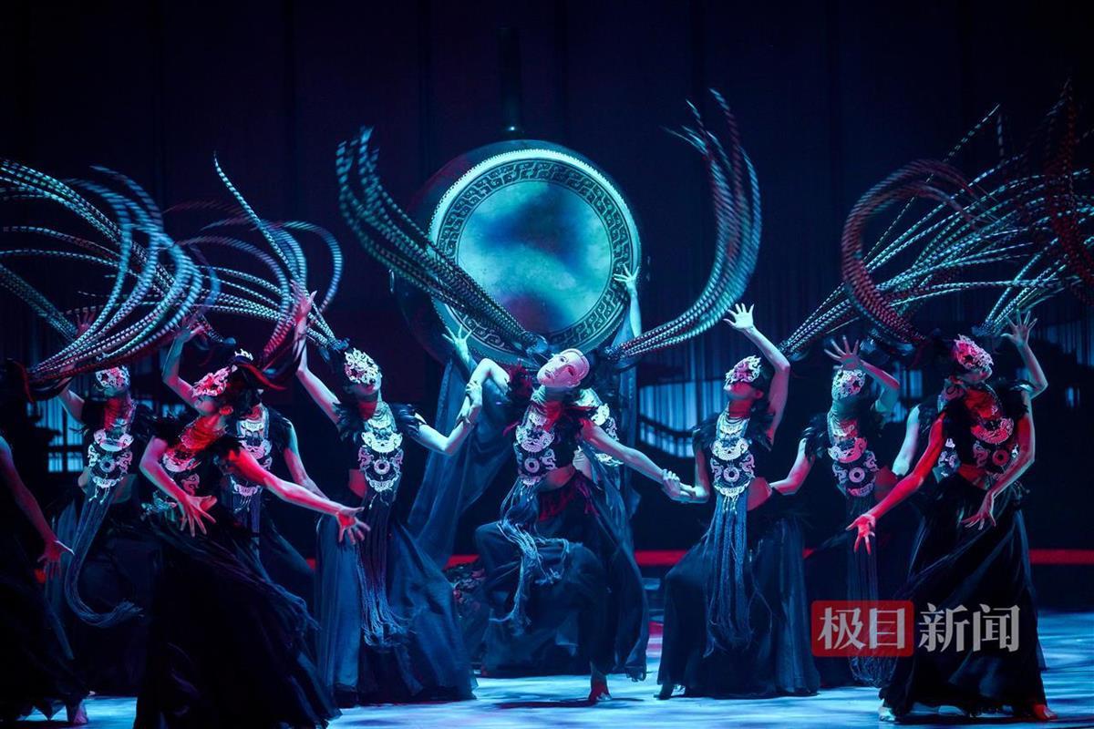 观众还能在舞台上看到从湖北省博物馆里1:1复刻的整组编钟与虎座凤架悬鼓,能看到凤凰、豹、双头鸟的出场,更能在音乐中听到氤氲不息的《楚辞》吟唱……