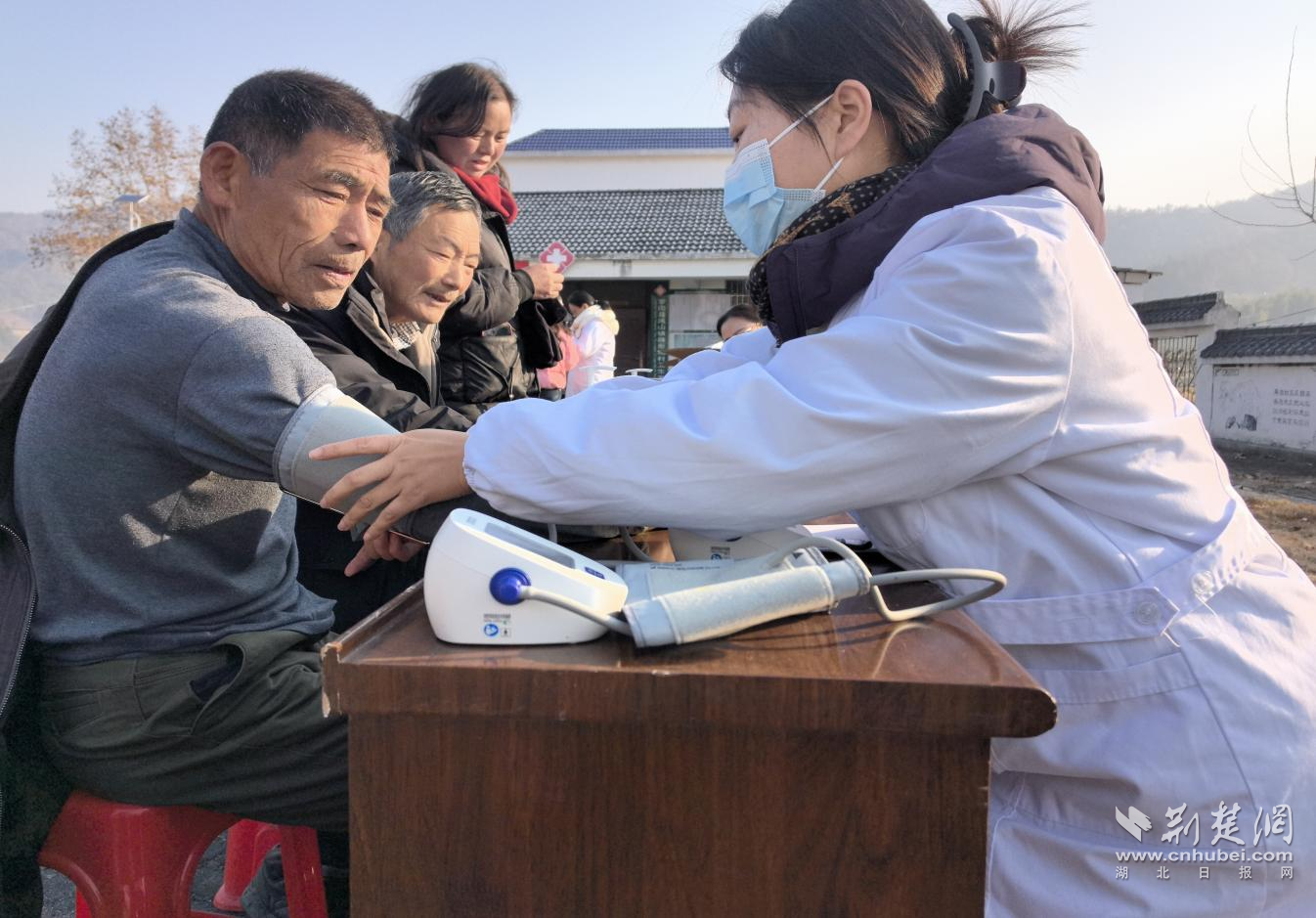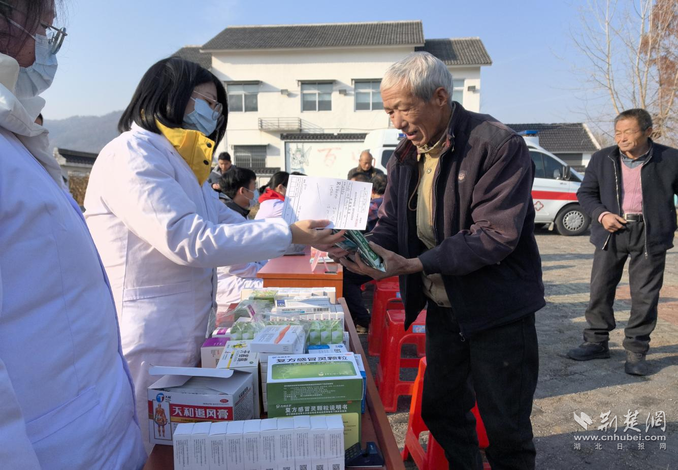 12月20日,簰形湾村村民广场正在举行一场健康义诊活动,来自黄冈市荣军优抚医院的8位医疗专家正在给乡亲们把脉看诊开药方。