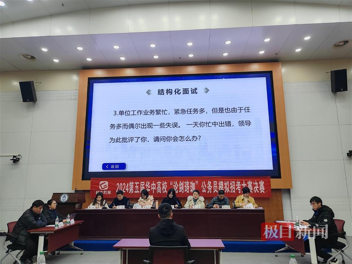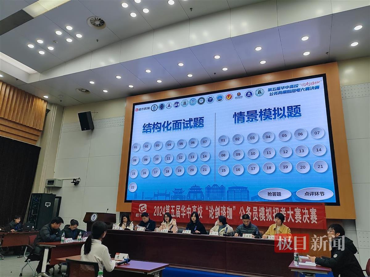 12月23日,第五届华中高校“论剑珞珈”公务员模拟招考大赛决赛在武汉大学法学院举办。逼真的环节设置和考题,让这场大赛看点十足。来自武汉大学等13所高校的16名选手,现场展开激烈角逐。