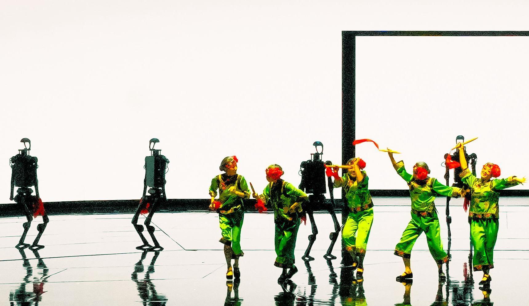 《秧歌·数控》展现了中国北方地区广泛流传的民间舞蹈,人形机器人演员拿着红巾,整齐划一地扭着秧歌。它展现出人们对生活的热爱和最纯粹的快乐,也是对人工智能时代到来的反思与共融。