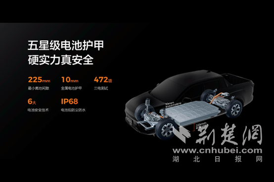 商用皮卡使用环境恶劣,用户对电池刮碰有着很大顾虑。雷达金刚离地间隙225mm,电池包护甲厚达10mm,这是很多乘用车的5倍以上,避免剐蹭也不怕剐蹭。电池包经过多达472项的严苛测试标准,如挤压、撞击、针刺、浸水等测试,远超国际标准。