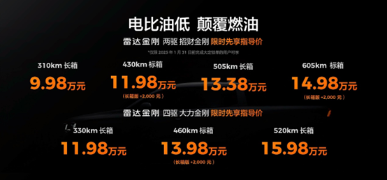 荆楚网(湖北日报网)讯(记者王博 通讯员蔡燏娜)12月23日,定位全球商乘两用纯电皮卡的雷达金刚正式上市。2025年1月31日前锁单的用户,还可享受限时先享指导价。两驱版招财金刚9.98万元起;四驱版大力金刚11.98万元起。雷达金刚以电比油低的方式,颠覆传统燃油皮卡,既是一台最具动力颠覆、省钱颠覆、操控颠覆、安全颠覆的纯电皮卡,价格又极具竞争力,是一台十万级最值得买的纯电皮卡。