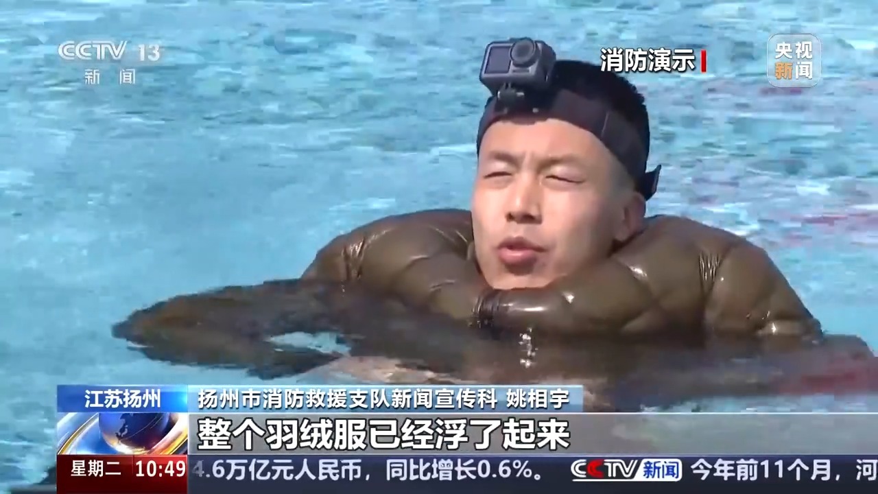 扬州市消防救援支队新闻宣传科 姚相宇:我刚才落水之后挣扎了一下,但是现在还是被这个薄的羽绒服给托起来了,但是明显没有那个厚的羽绒服浮力大,我的整个下半身是在下面吊着的,整个羽绒服已经浮了起来,这边好像有气一样,把我的脖子以上头部给托起来了。