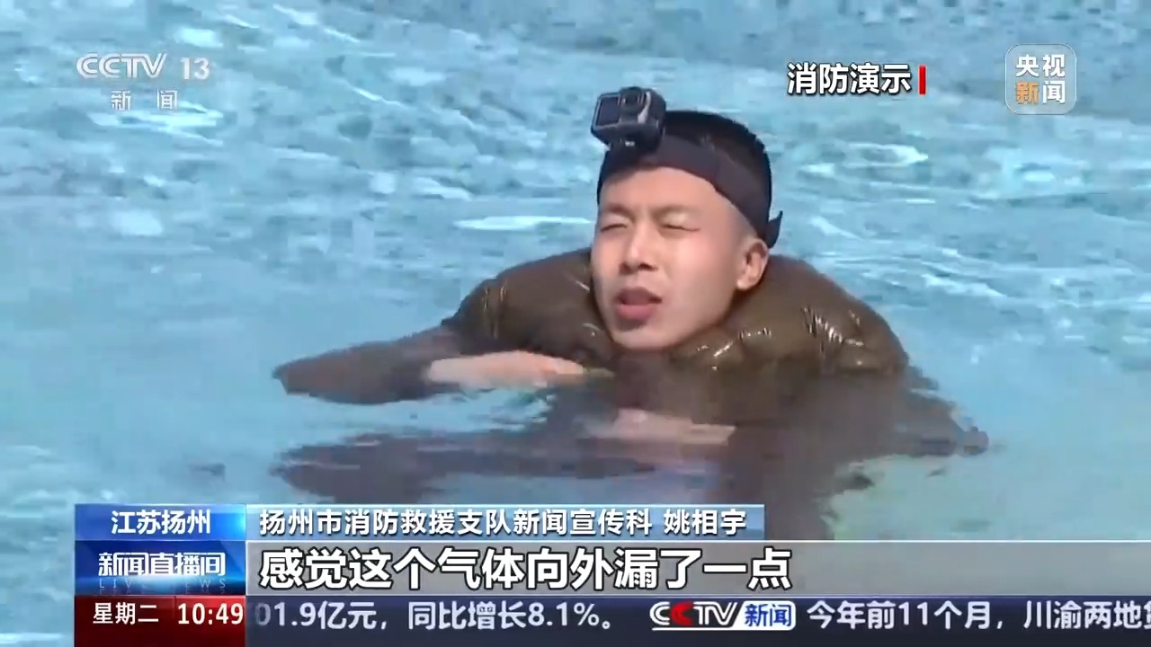 扬州市消防救援支队新闻宣传科 姚相宇:我试着挣扎了,感觉气体向外漏了一点,现在这个浮力好像小了一些。