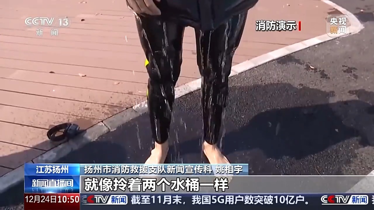 扬州市消防救援支队新闻宣传科 姚相宇:棉衣进水很快,我现在开始往下掉了,一上来感觉特别重,吸的水比羽绒服重两三倍,就像拎着两个水桶一样。