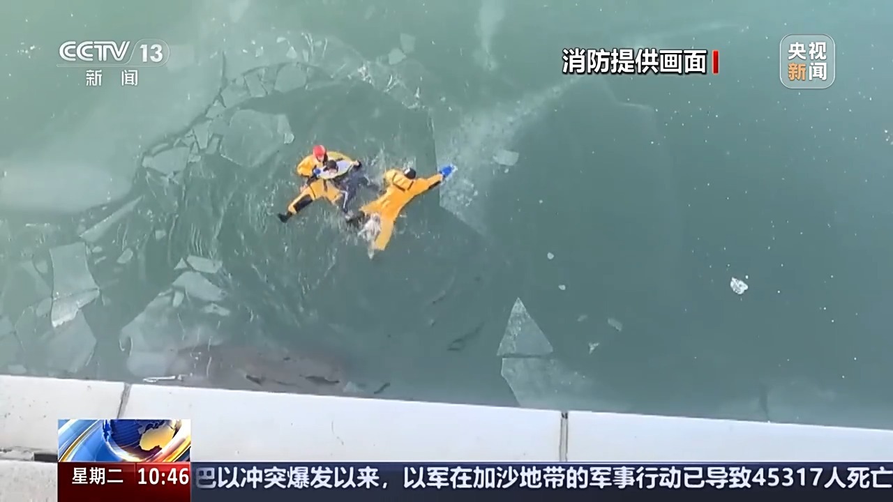 在岸上的救援人员利用安全绳将被困者拖拽至安全区域。随后,落水男子被紧急送往医院治疗,所幸并无大碍。类似的事故也发生在其他地方。近日,在辽宁抚顺,一中学生就因穿越河面,意外坠入冰河。消防员赶到现场后看到,女孩穿着棉衣,借助棉衣产生的短时浮力暂时浮在了冰水中,同时双手抓住冰面的边缘。两名消防员先后来到女孩身边,尝试用棍子进行救援,但事发水域的冰面较薄,出现了碎裂。