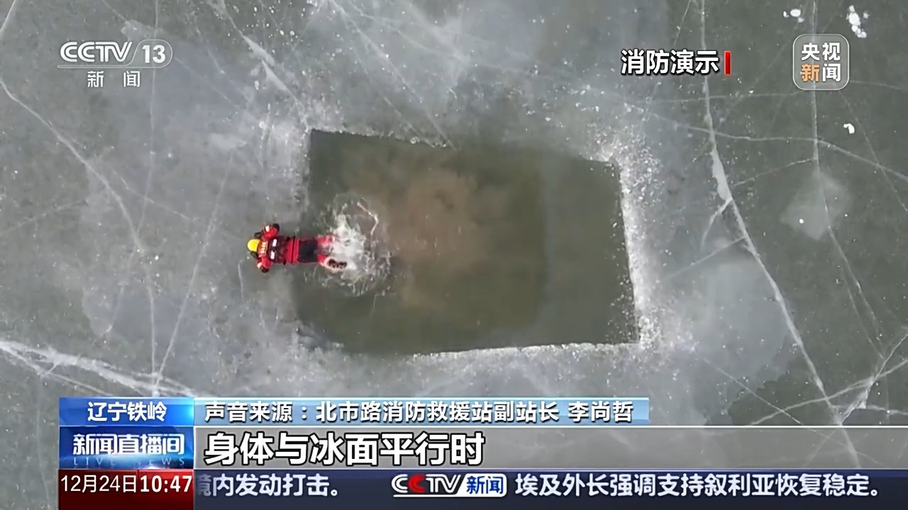 北市路消防救援站副站长 李尚哲:正确的做法是双手扶在冰面上,用双腿上下打水,让身体上浮,身体与冰面平行时,手肘支撑冰面向安全区移动,离开冰窟窿后不要马上站起来,因为冰面很有可能再次断裂导致你重复落水,请继续保持缓慢翻滚或爬行的方式向岸边移动。