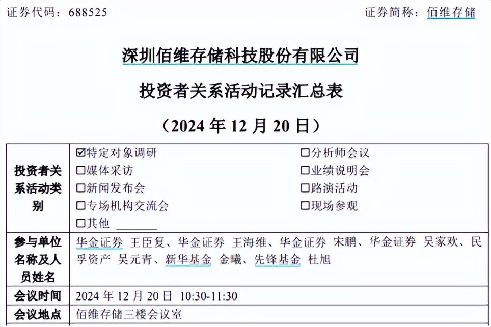 【环球网财经记者 田刚】12月24日盘后,上市公司佰维存储(688525.SH)发布了《投资者关系活动记录汇总表》,披露公司接待了华金证券、华金证券、华金证券等多家机构调研,公司董事会秘书、财务总监黄炎烽参与,并解答投资机构代表提问。
