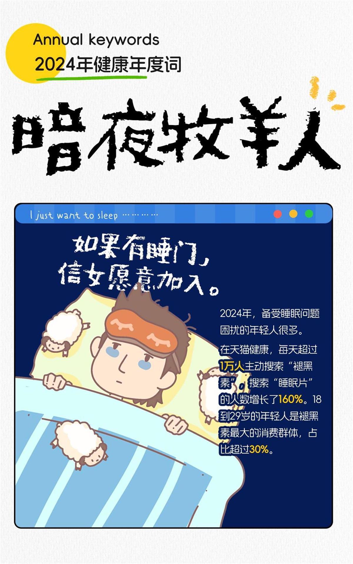 在天猫健康,每天超过1万人主动搜索“褪黑素”,搜索“睡眠片”的人数增长了160%。18到29岁的年轻人是褪黑素最大的消费群体,占比超过30%。