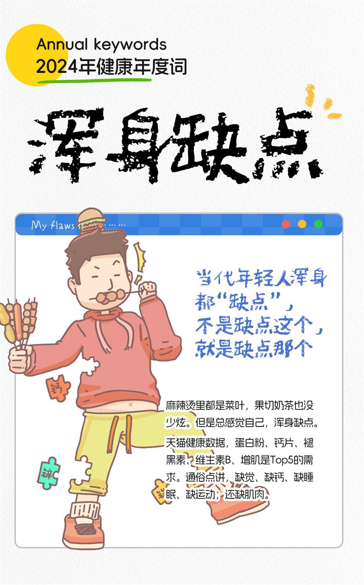 缺点啥?缺觉、缺钙、缺睡眠、缺运动,还缺肌肉。天猫健康数据显示,蛋白粉、钙片、褪黑素、维生素B、增肌是Top5的需求。