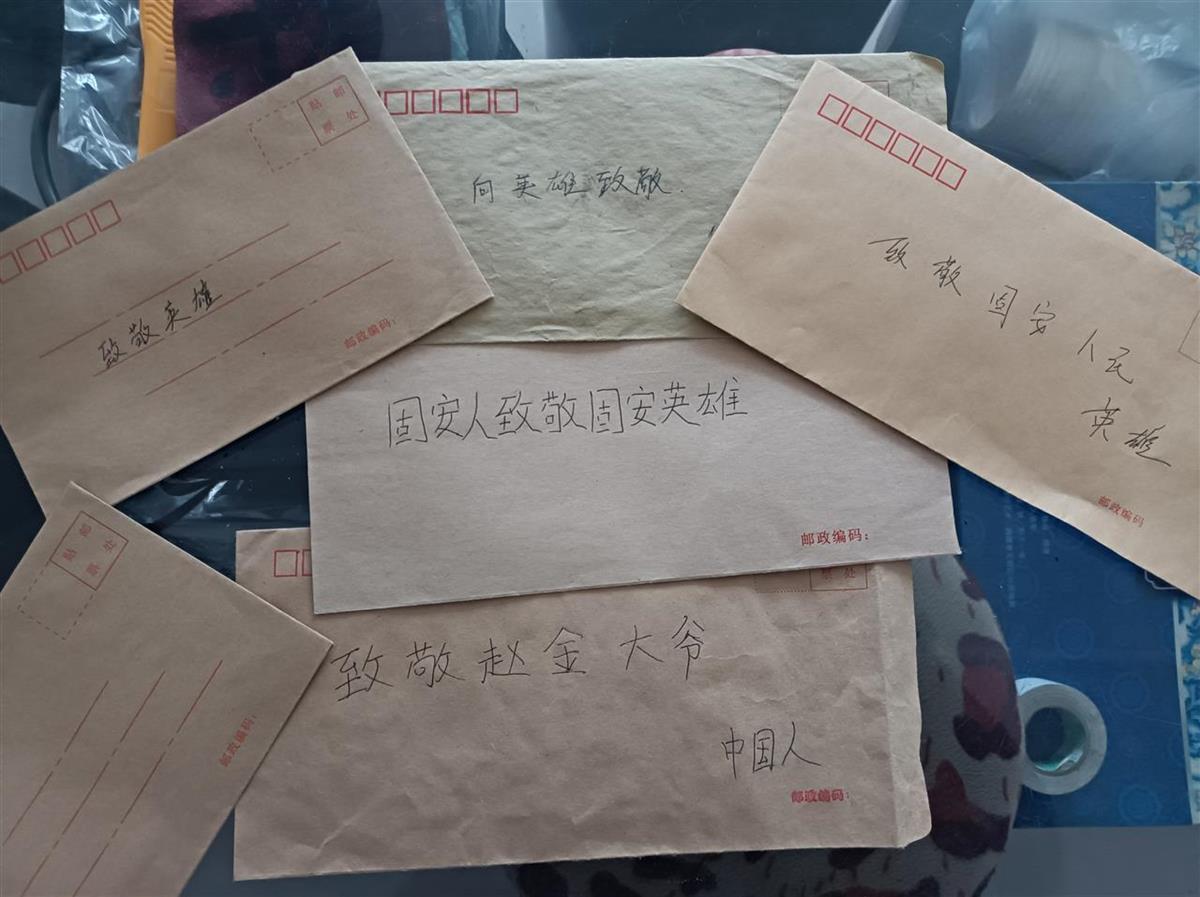装着慰问金的七个信封上有留言:“向英雄致敬”“固安人致敬固安英雄”“致敬赵金大爷”……只有一个信封有落款,落款是“中国人”。
