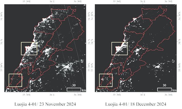 “借助珞珈四号01星在11月23日拍摄的图像,可以明显看到,黎巴嫩南部灯光损失严重,代表那里发生了战乱。12月18日再度拍摄的图像显示,黎以达成停火协议后,黎巴嫩南部区域的灯光快速恢复,这也意味着有了和平的希望。”李熙告诉记者,珞珈四号01星的分辨率有150米,就像一个放大镜,可以通过受灾前后的灯光对比,看清受灾区域的空间分布,找到灯光微弱的严重受灾地区,为制定针对性救援策略提供信息支撑。