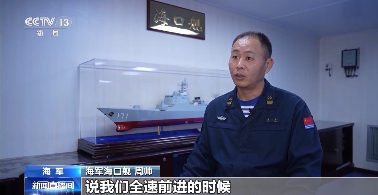 海军海口舰 周帅:当操作人员下达一个口令,说全速前进的时候。当操作人员把手柄推下去的时候。通过发动机都能感受到,哇,这时候战舰要出击了,战舰要飞驰了。